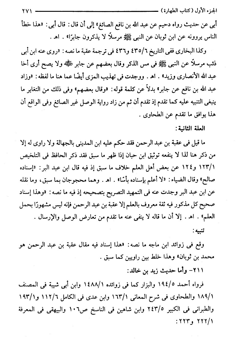 وكذا البخاري ففي التاريخ 6/ 435 و 436 في ترجمة عقبة ما نصه: "روى عنه ابن أبى ذئب مرسلًا عن النبي - صلى الله عليه وسلم - في مس الذكر وقال بعضهم عن جابر - رضي الله عنه - ولا يصح أرى أخا عبد الله الأنصارى وزيد". اهـ. ووجدت في تهذيب المزى أيضًا عما هنا ما لفظه: "وزاد عبد الله بن نافع عن جابر" بدلًا عن كلمة قوله: "وقال بعضهم" وفى ذلك من التغاير ما ينبغى التنبيه عليه كما تقدم إذ تقدم أن ثم من زاد رواية الوصل غير الصائغ وفى الواقع أن هذا يوافق ما تقدم عن الطحاوى.