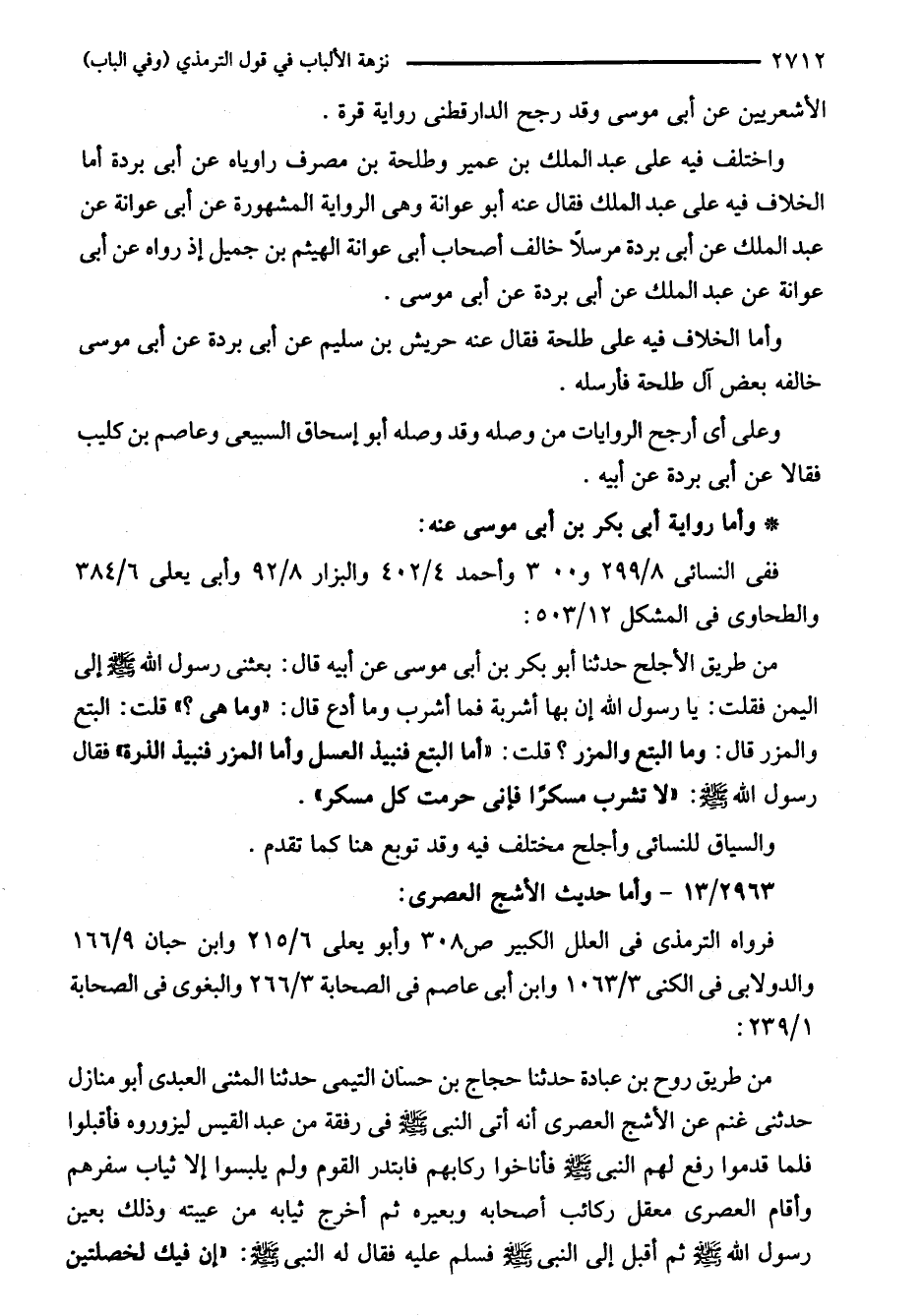 من طريق الأجلح حدثنا أبو بكر بن أبي موسى عن أبيه قال: بعثنى رسول اللَّه - صلى اللَّه عليه وسلم - إلى اليمن فقلت: يا رسول اللَّه إن بها أشربة فما أشرب وما أدع قال: "وما هي؟ " قلت: البتع والمزر قال: وما البتع والمزر؟ قلت: "أما البتع فنبيذ العسل وأما المزر فنبيذ الذرة" فقال رسول اللَّه - صلى اللَّه عليه وسلم -: "لا تشرب مسكرًا فإنى حرمت كل مسكر".