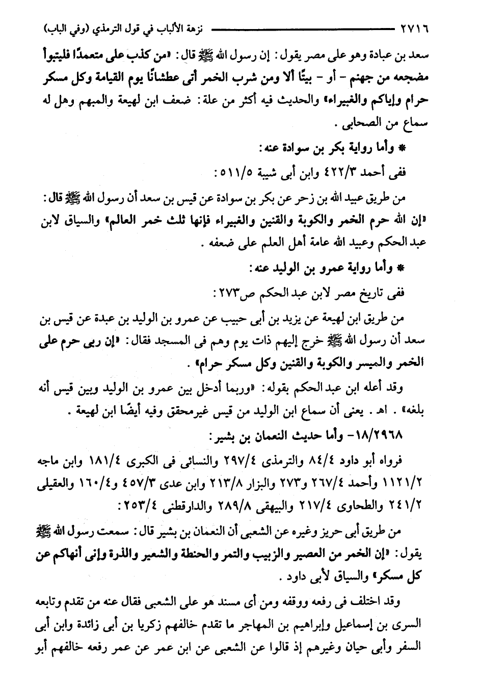 سعد بن عبادة وهو على مصر يقول: إن رسول اللَّه - صلى اللَّه عليه وسلم - قال: "من كذب على متعمدًا فليتبوأ مضجعه من جهنم -أو- بيتًا ألا ومن شرب الخمر أتى عطشانًا يوم القيامة وكل مسكر حرام وإياكم والغبيراء" والحديث فيه أكثر من علة: ضعف ابن لهيعة والمبهم وهل له سماع من الصحابي.