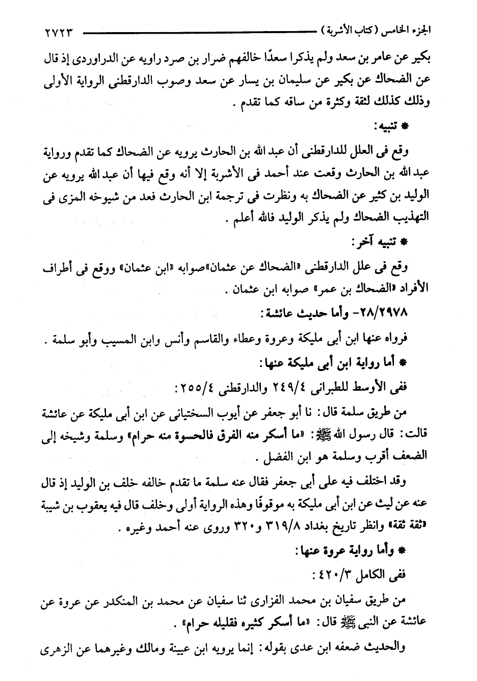 من طريق سفيان بن محمد الفزارى ثنا سفيان عن محمد بن المنكدر عن عروة عن عائشة عن النبي - صلى اللَّه عليه وسلم - قال: "ما أسكر كثيره فقليله حرام".
