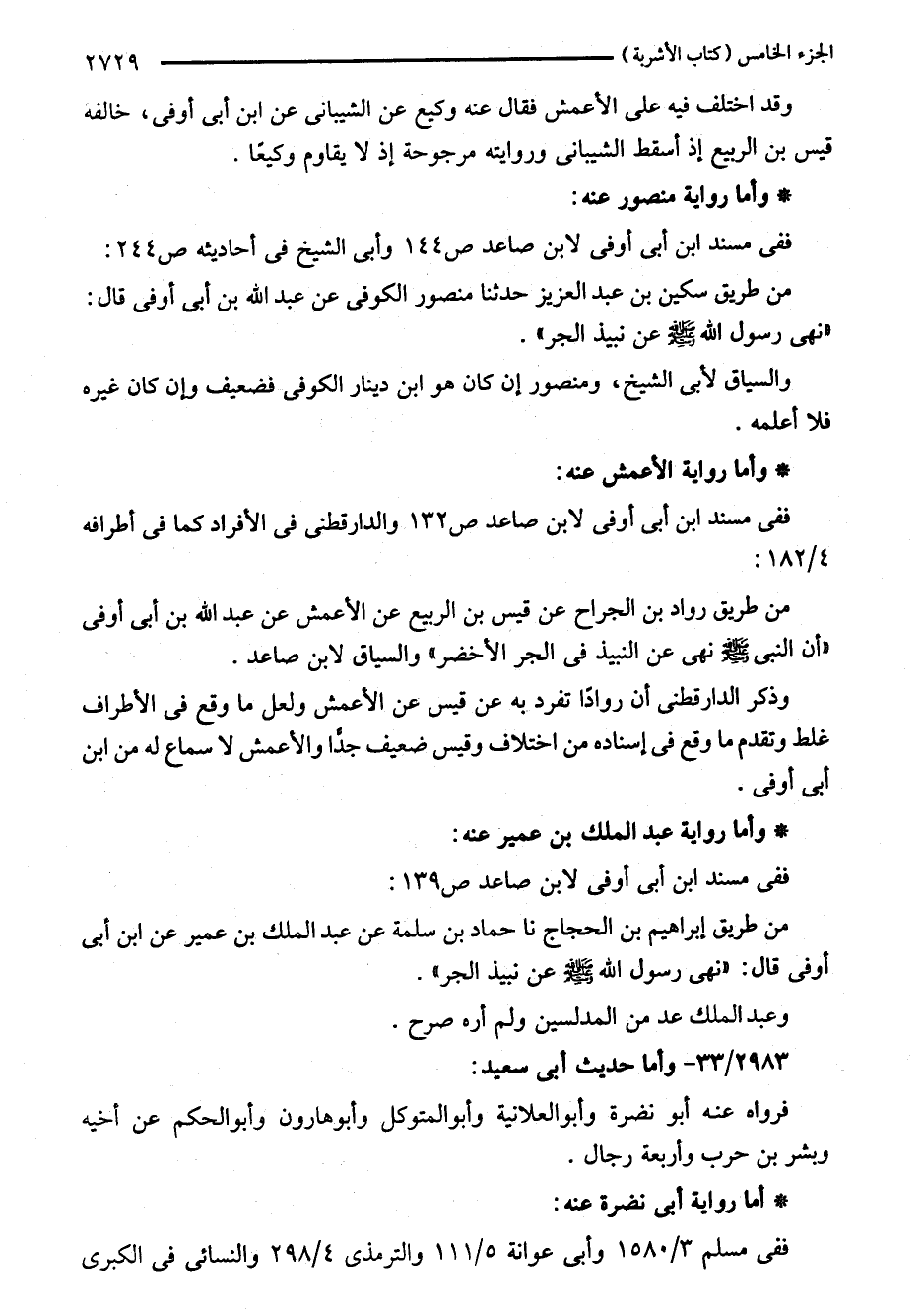 من طريق رواد بن الجراح عن قيس بن الربيع عن الأعمش عن عبد اللَّه بن أبي أوفى "أن النبي - صلى اللَّه عليه وسلم - نهى عن النبيذ في الجر الأخضر" والسياق لابن صاعد.