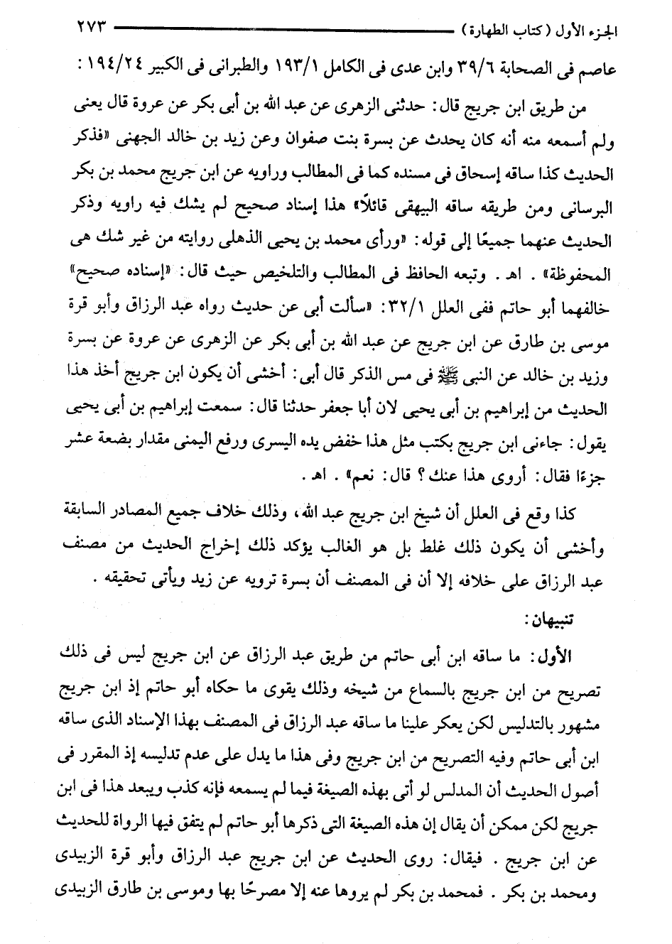 الأول: ما ساقه ابن أبى حاتم من طريق عبد الرزاق عن ابن جريج ليس في ذلك تصريح من ابن جريج بالسماع من شيخه وذلك يقوى ما حكاه أبو حاتم إذ ابن جريج مشهور بالتدليس لكن يعكر علينا ما ساقه عبد الرزاق في المصنف بهذا الإسناد الذى ساقه ابن أبى حاتم وفيه التصريح من ابن جريج وفى هذا ما يدل على عدم تدليسه إذ المقرر في أصول الحديث أن المدلس لو أتى بهذه الصيغة فيما لم يسمعه فإنه كذب ويبعد هذا في ابن جريج لكن ممكن أن يقال إن هذه الصيغة التى ذكرها أبو حاتم لم يتفق فيها الرواة للحديث عن ابن جريج. فيقال: روى الحديث عن ابن جريج عبد الرزاق وأبو قرة الزبيدى ومحمد بن بكر. فمحمد بن بكر لم يروها عنه إلا مصرحًا بها وموسى بن طارق الزبيدى