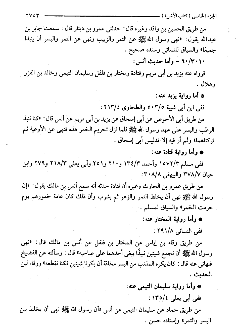 من طريق أبي الأحوص عن أبي إسحاق عن يزيد بن أبي مريم عن أنس قال: "كنا ننبذ الرطب والبسر على عهد رسول اللَّه - صلى اللَّه عليه وسلم - فلما نزل تحريم الخمر هذه فنهى عن الأوعية ثم تركناهما" ولم أر فيه إلا تدليس أبي إسحاق.