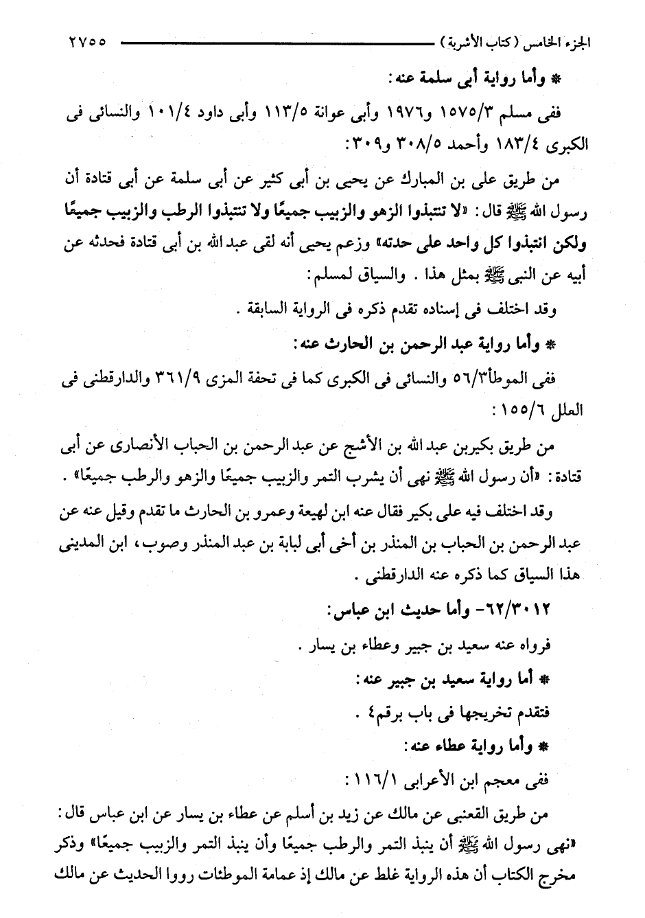 من طريق على بن المبارك عن يحيى بن أبي كثير عن أبي سلمة عن أبي قتادة أن رسول اللَّه - صلى اللَّه عليه وسلم - قال: "لا تنتبذوا الزهو والزبيب جميعًا ولا تنتبذوا الرطب والزبيب جميعًا ولكن انتبذوا كل واحد على حدته" وزعم يحيى أنه لقى عبد اللَّه بن أبي قتادة فحدثه عن أبيه عن النبي - صلى اللَّه عليه وسلم - بمثل هذا. والسياق لمسلم: