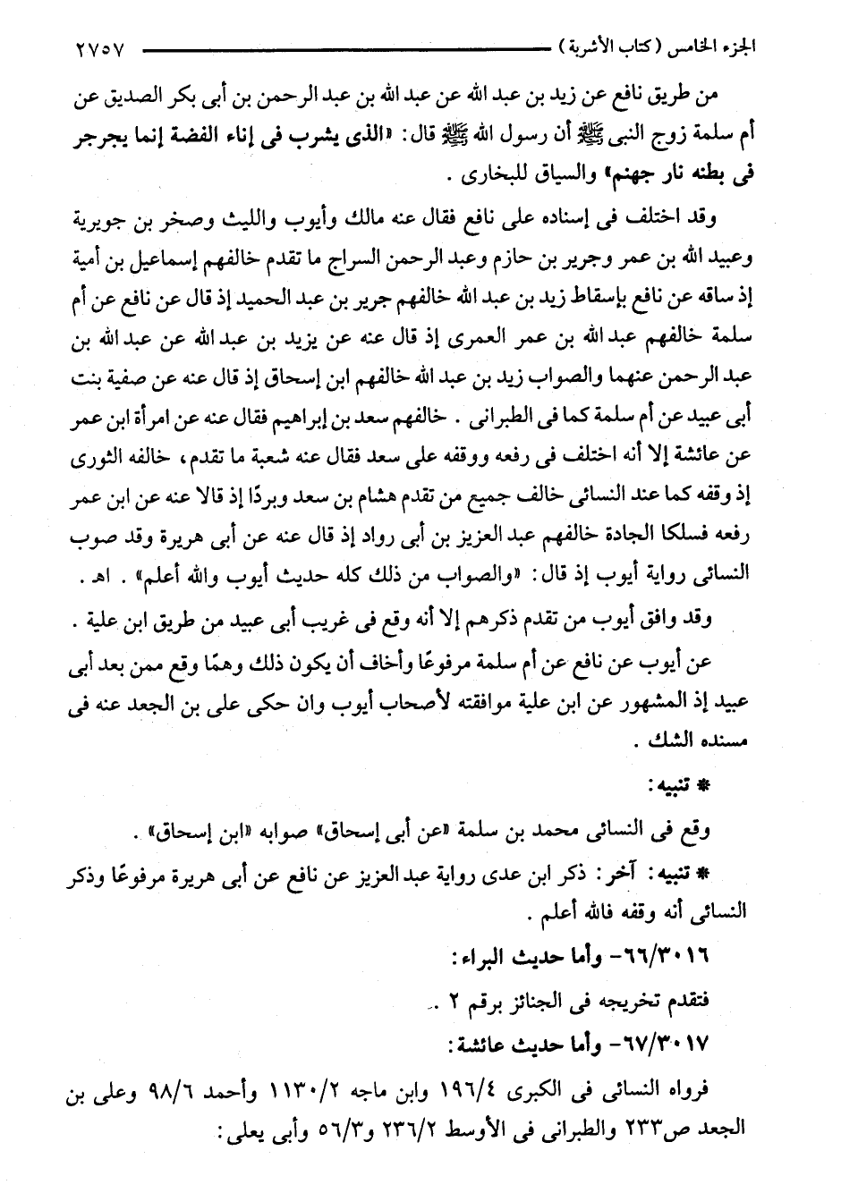 وقد اختلف في إسناده على نافع فقال عنه مالك وأيوب والليث وصخر بن جويرية وعبيد اللَّه بن عمر وجرير بن حازم وعبد الرحمن السراج ما تقدم خالفهم إسماعيل بن أمية إذ ساقه عن نافع بإسقاط زيد بن عبد اللَّه خالفهم جرير بن عبد الحميد إذ قال عن نافع عن أم سلمة خالفهم عبد اللَّه بن عمر العمرى إذ قال عنه عن يزيد بن عبد اللَّه عن عبد اللَّه بن عبد الرحمن عنهما والصواب زيد بن عبد اللَّه خالفهم ابن إسحاق إذ قال عنه عن صفية بنت أبي عبيد عن أم سلمة كما في الطبراني. خالفهم سعد بن إبراهيم فقال عنه عن امرأة ابن عمر عن عائشة إلا أنه اختلف في رفعه ووقفه على سعد فقال عنه شعبة ما تقدم، خالفه الثورى إذ وقفه كما عند النسائي خالف جميع من تقدم هشام بن سعد وبردًا إذ قالا عنه عن ابن عمر رفعه فسلكا الجادة خالفهم عبد العزيز بن أبي رواد إذ قال عنه عن أبي هريرة وقد صوب النسائي رواية أيوب إذ قال: "والصواب من ذلك كله حديث أيوب واللَّه أعلم". اهـ.