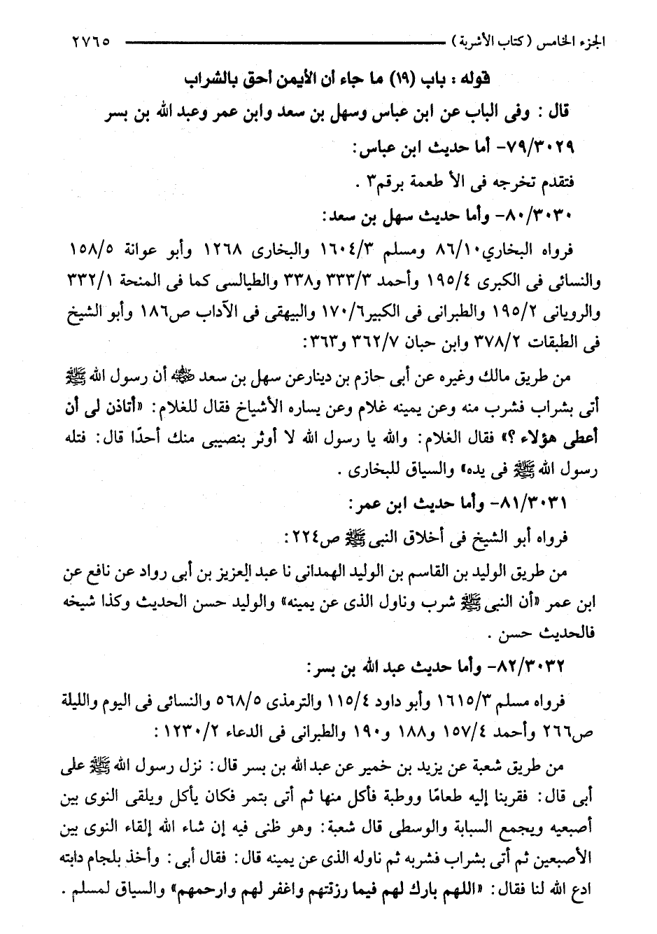 من طريق الوليد بن القاسم بن الوليد الهمدانى نا عبد العزيز بن أبي رواد عن نافع عن ابن عمر "أن النبي في شرب وناول الذى عن يمينه" والوليد حسن الحديث وكذا شيخه فالحديث حسن.