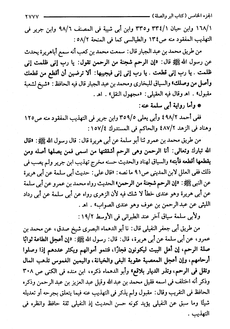 من طريق محمد بن عمرو ثنا أبو سلمة عن أبي هريرة قال: قال رسول اللَّه - صلى اللَّه عليه وسلم -: "قال اللَّه تبارك وتعالى: أنا الرحمن وهى الرحم أشققتها من اسمى فمن يصلها أصله ومن يقطعها أقطعه فأبته" والسياق لهناد والحديث حسنه مخرج تهذيب ابن جرير ولم يصب في ذلك ففي العلل لابن المدينى ص 91 ما نصه: "قال على: حديث أبي سلمة عن أبي هريرة عن النبي - صلى اللَّه عليه وسلم -: "إن الرحم شجنة من الرحمن" الحديث رواه محمد بن عمرو عن أبي سلمة عن أبي هريرة وهو عندى خطأ لا شك فيه لأن الزهرى رواه عن أبي سلمة عن أبي رداد الليثى عن عبد الرحمن بن عوف وهو عندى الصواب". اهـ.