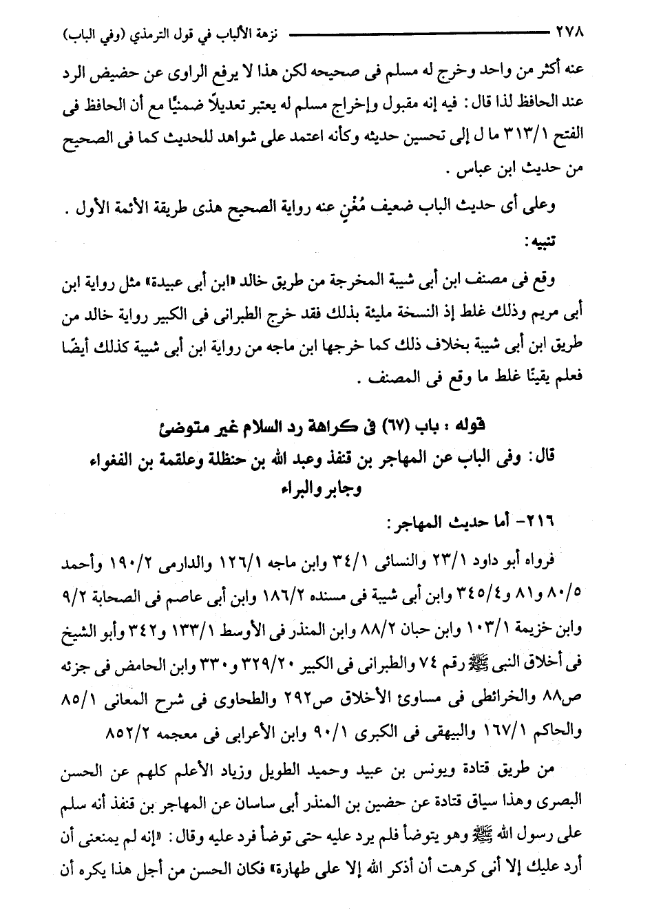 من طريق قتادة ويونس بن عبيد وحميد الطويل وزياد الأعلم كلهم عن الحسن البصرى وهذا سياق قتادة عن حضين بن المنذر أبى ساسان عن المهاجر بن قنفذ أنه سلم على رسول الله صلى الله عليه وسلم وهو يتوضأ فلم يرد عليه حتى توضأ فرد عليه وقال: "إنه لم يمنعنى أن أرد عليك إلا أنى كرهت أن أذكر الله إلا على طهارة" فكان الحسن من أجل هذا يكره أن