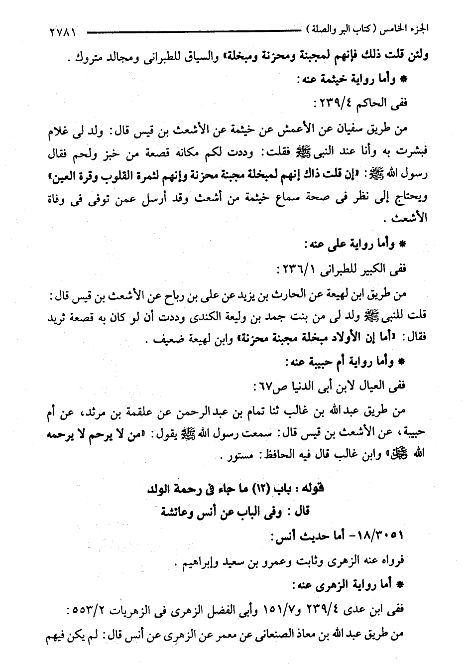 من طريق ابن لهيعة عن الحارث بن يزيد عن على بن رباح عن الأشعث بن قيس قال: قلت للنبي - صلى اللَّه عليه وسلم - ولد لى من بنت جمد بن وليعة الكندى وددت أن لو كان به قصعة ثريد فقال: "أما إن الأولاد مبخلة مجبنة محزنة" وابن لهيعة ضعيف.