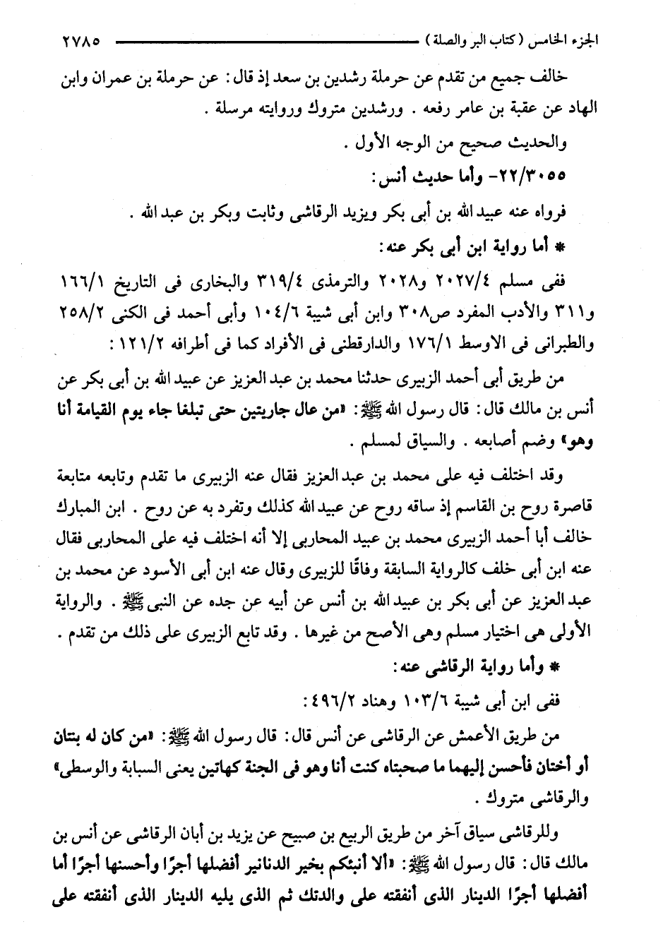 وللرقاشي سياق آخر من طريق الربيع بن صبيح عن يزيد بن أبان الرقاشى عن أنس بن مالك قال: قال رسول اللَّه - صلى اللَّه عليه وسلم -: "ألا أنبئكم بخير الدنانير أفضلها أجرًا وأحسنها أجرًا أما أفضلها أجرًا الدينار الذي أنفقته على والدتك ثم الذي يليه الدينار الذي أنفقته على