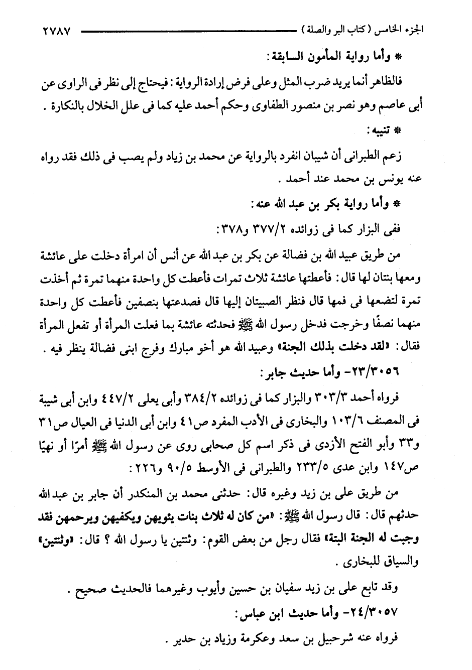 من طريق عبيد اللَّه بن فضالة عن بكر بن عبد اللَّه عن أنس أن امرأة دخلت على عائشة ومعها بنتان لها قال: فأعطتها عائشة ثلاث تمرات فأعطت كل واحدة منهما تمرة ثم أخذت تمرة لتضعها في فمها قال فنظر الصبيتان إليها قال فصدعتها بنصفين فأعطت كل واحدة منهما نصفًا وخرجت فدخل رسول اللَّه - صلى اللَّه عليه وسلم - فحدثته عائشة بما فعلت المرأة أو تفعل المرأة فقال: "لقد دخلت بذلك الجنة" وعبيد اللَّه هو أخو مبارك وفرج ابنى فضالة ينظر فيه.