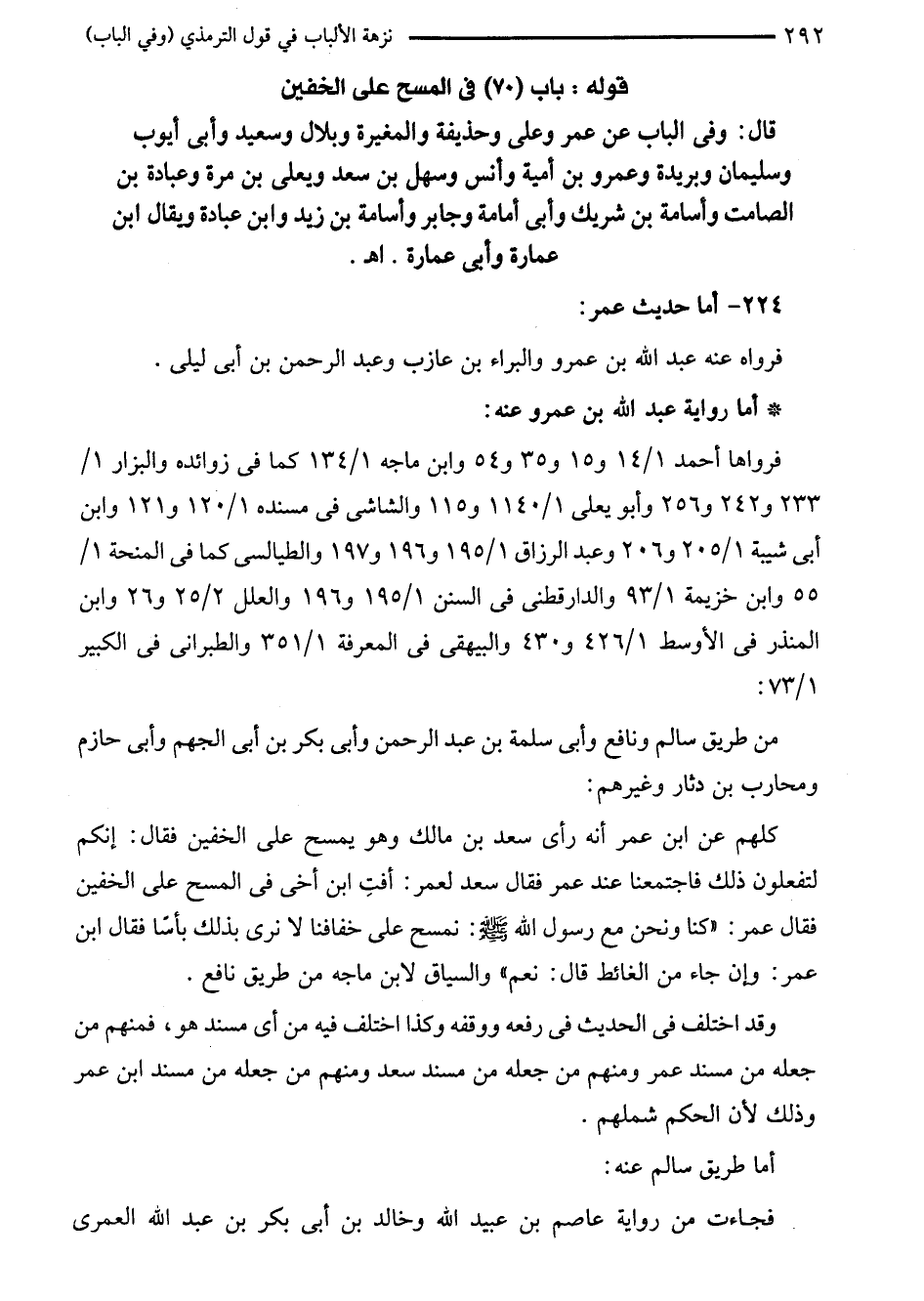 كلهم عن ابن عمر أنه رأى سعد بن مالك وهو يمسح على الخفين فقال: إنكم لتفعلون ذلك فاجتمعنا عند عمر فقال سعد لعمر: أفتِ ابن أخى في المسح على الخفين فقال عمر: "كنا ونحن مع رسول الله - صلى الله عليه وسلم -: نمسح على خفافنا لا نرى بذلك بأسًا فقال ابن عمر: وإن جاء من الغائط قال: نعم" والسياق لابن ماجه من طريق نافع.