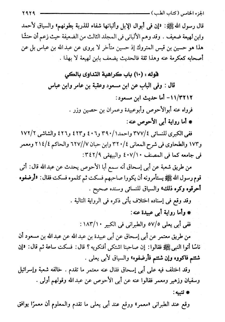 من طريق شعبة عن أبي إسحاق أنه سمع أبا الأحوص يحدث عن عبد اللَّه قال: أتى قوم رسول اللَّه - صلى اللَّه عليه وسلم - يستأمرونه أن يكووا صاحبهم فسكت ثم كلموه فسكت فقال: "أرضفوه أحرقوه وكره ذلك" والسياق للنسائي وسنده صحيح.