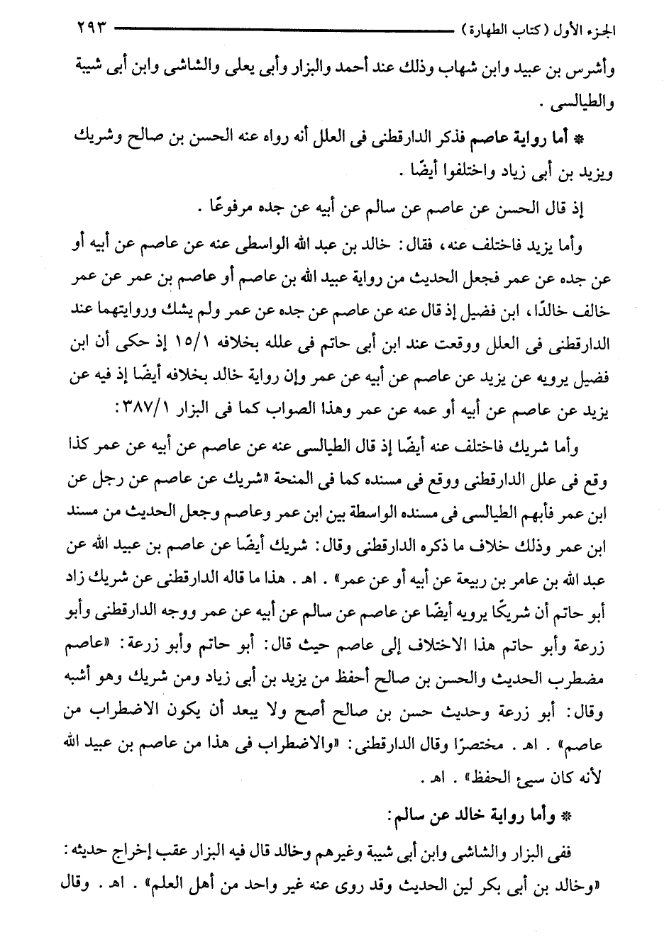 وأما شريك فاختلف عنه أيضًا إذ قال الطيالسى عنه عن عاصم عن أبيه عن عمر كذا وقع في علل الدارقطني ووقع في مسنده كما في المنحة "شريك عن عاصم عن رجل عن ابن عمر فأبهم الطيالسى في مسنده الواسطة بين ابن عمر وعاصم وجعل الحديث من مسند ابن عمر وذلك خلاف ما ذكره الدارقطني وقال: شريك أيضًا عن عاصم بن عبيد الله عن عبد الله بن عامر بن ربيعة عن أبيه أو عن عمر". اهـ. هذا ما قاله الدارقطني عن شريك زاد أبو حاتم أن شريكًا يرويه أيضًا عن عاصم عن سالم عن أبيه عن عمر ووجه الدارقطني وأبو زرعة وأبو حاتم هذا الاختلاف إلى عاصم حيث قال: أبو حاتم وأبو زرعة: "عاصم مضطرب الحديث والحسن بن صالح أحفظ من يزيد بن أبى زياد ومن شريك وهو أشبه وقال: أبو زرعة وحديث حسن بن صالح أصح ولا يبعد أن يكون الاضطراب من عاصم". اهـ. مختصرًا وقال الدارقطني: "والاضطراب في هذا من عاصم بن عبيد الله لأنه كان سيئ الحفظ". اهـ.