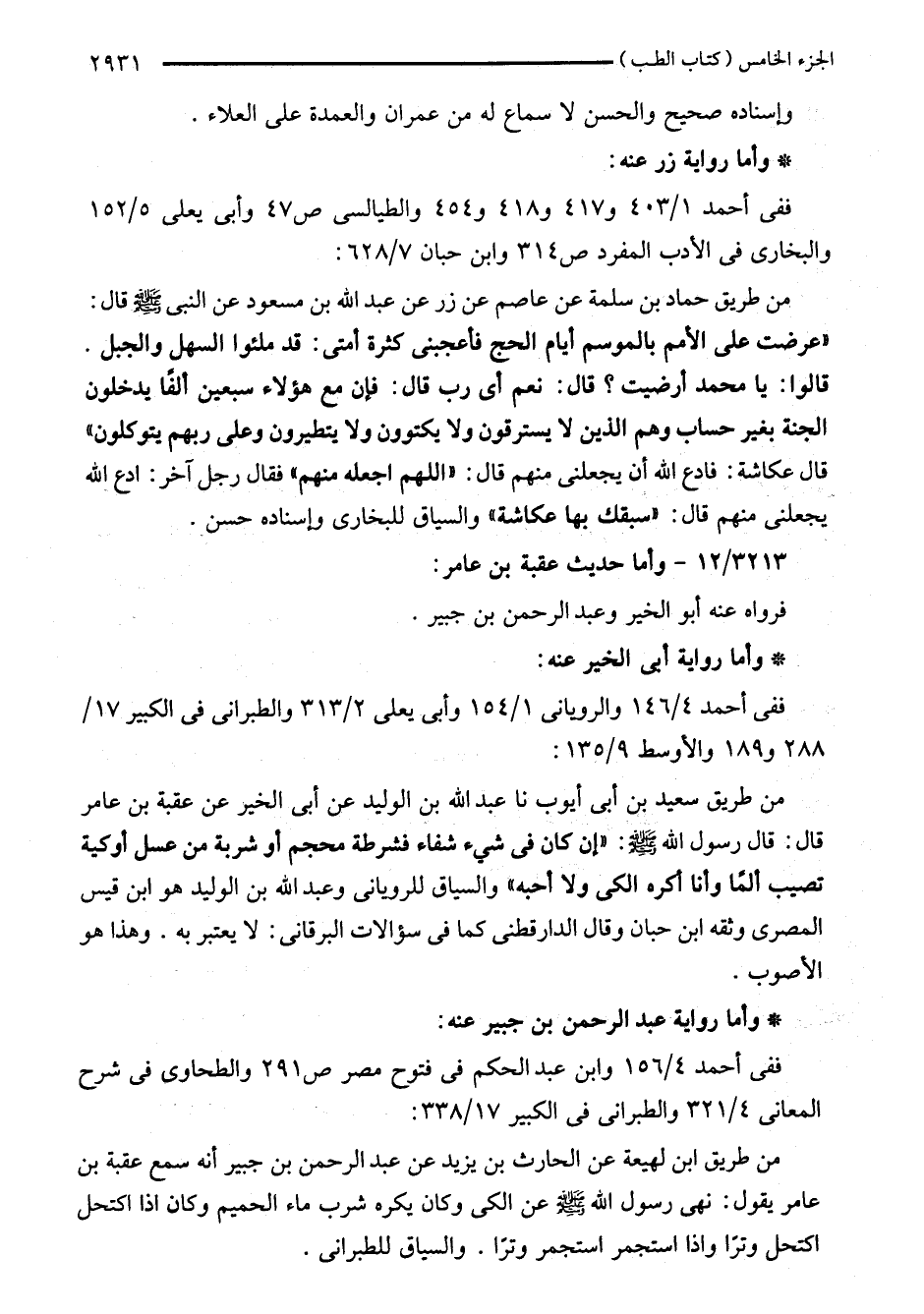 من طريق ابن لهيعة عن الحارث بن يزيد عن عبد الرحمن بن جبير أنه سمع عقبة بن عامر يقول: نهى رسول اللَّه - صلى اللَّه عليه وسلم - عن الكى وكان يكره شرب ماء الحميم وكان إذا اكتحل اكتحل وترًا وإذا استجمر استجمر وترًا. والسياق للطبراني.