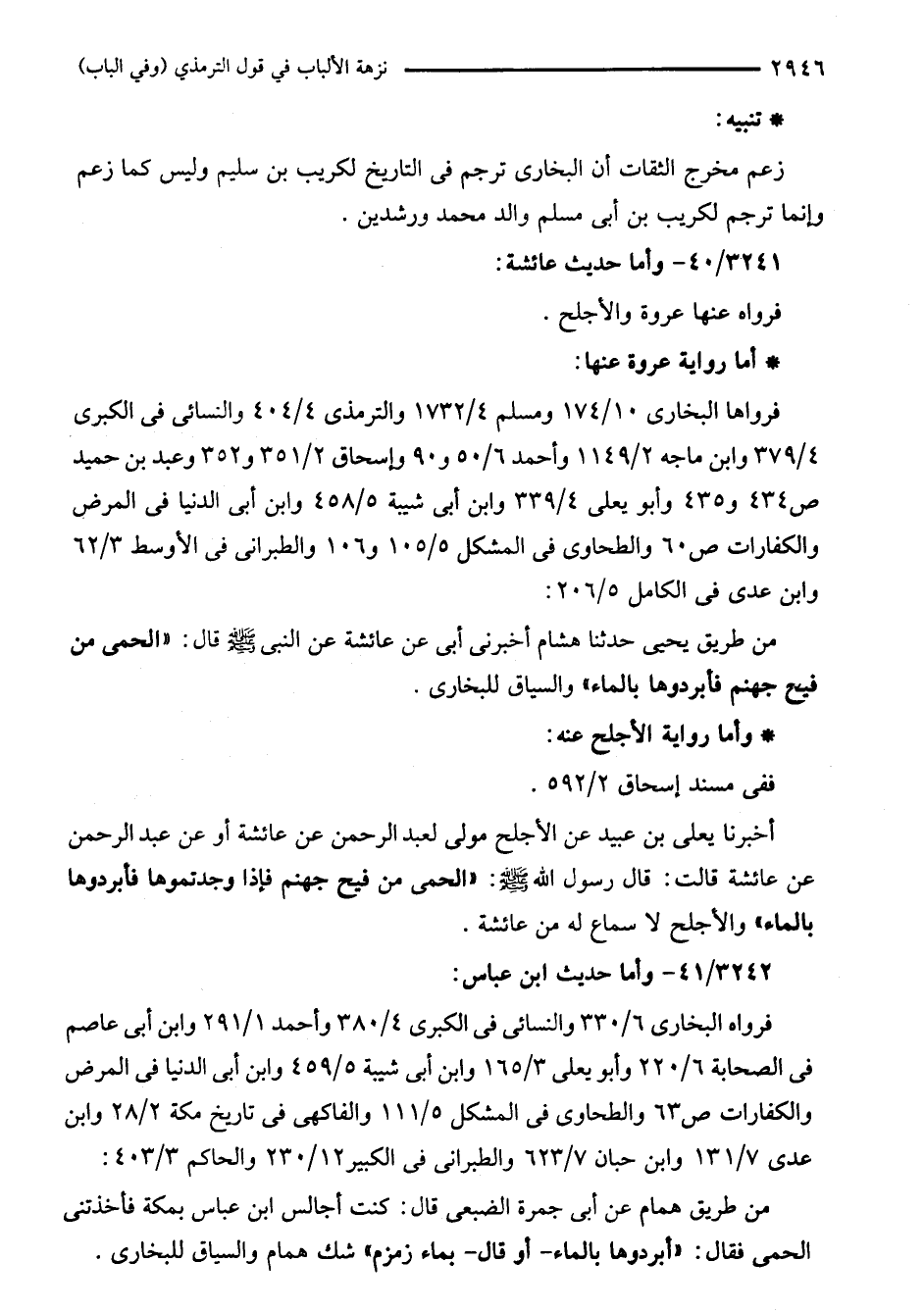 من طريق يحيى حدثنا هشام أخبرنى أبي عن عائشة عن النبي - صلى اللَّه عليه وسلم - قال: "الحمى من فيح جهنم فأبردوها بالماء" والسياق للبخاري.