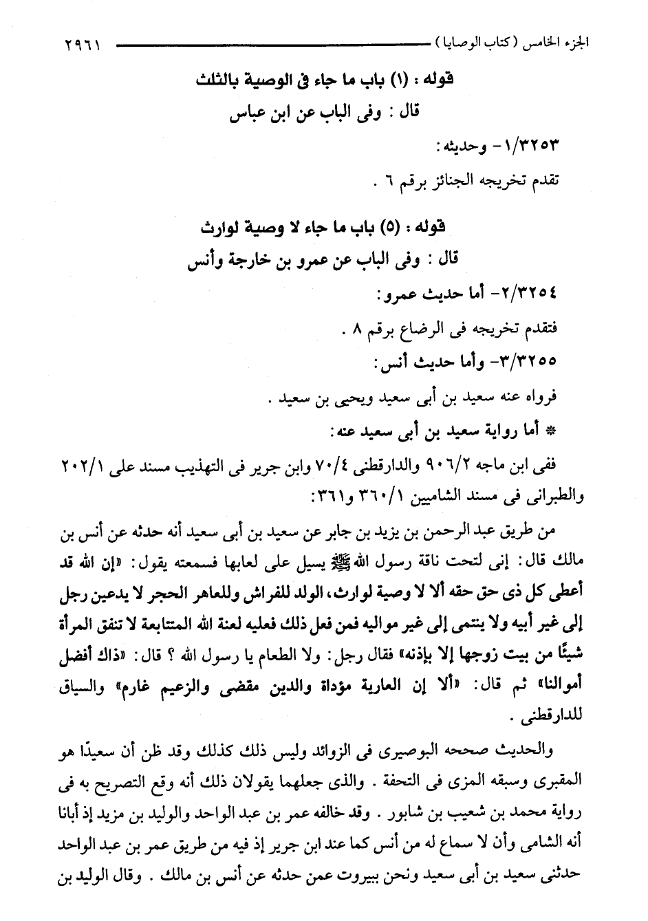 من طريق عبد الرحمن بن يزيد بن جابر عن سعيد بن أبي سعيد أنه حدثه عن أنس بن مالك قال: إني لتحت ناقة رسول اللَّه - صلى اللَّه عليه وسلم - يسيل على لعابها فسمعته يقول: "إن اللَّه قد أعطى كل ذي حق حقه ألا لا وصية لوارث، الولد للفراش وللعاهر الحجر لا يدعين رجل إلى غير أبيه ولا ينتمى إلى غير مواليه فمن فعل ذلك فعليه لعنة اللَّه المتتابعة لا تنفق المرأة شيئًا من بيت زوجها إلا بإذنه" فقال رجل: ولا الطعام يا رسول اللَّه؟ قال: "ذاك أفضل أموالنا" ثم قال: "ألا إن العارية مؤداة والدين مقضى والزعيم غارم" والسياق للدارقطني.