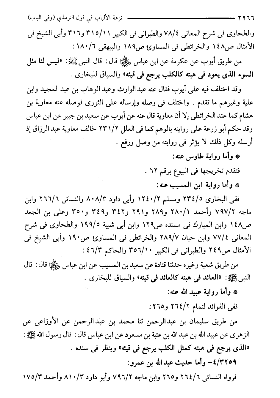 من طريق سليمان بن عبد الرحمن ثنا محمد بن عبد الرحمن عن الأوزاعى عن الزهرى عن عبيد اللَّه بن عبد اللَّه بن عتبة بن مسعود عن ابن عباس قال: قال رسول اللَّه - صلى اللَّه عليه وسلم -: "الذى يرجع في هبته كمثل الكلب يرجع في قيئه" وينظر في سنده.