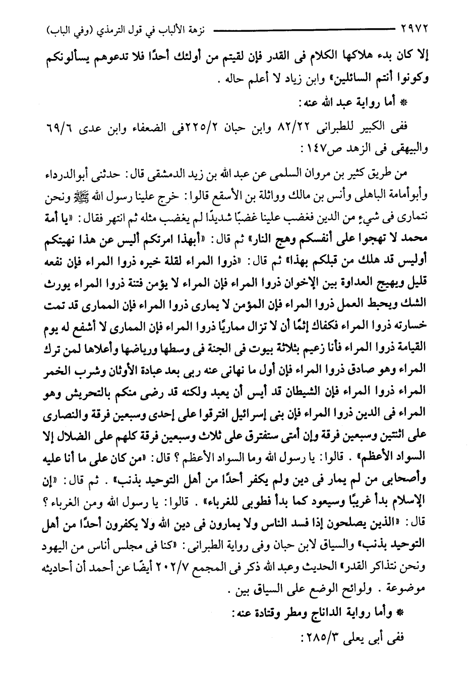 من طريق كثير بن مروان السلمى عن عبد اللَّه بن زيد الدمشقي قال: حدثنى أبو الدرداء وأبو أمامة الباهلى وأنس بن مالك وواثلة بن الأسقع قالوا: خرج علينا رسول اللَّه - صلى اللَّه عليه وسلم - ونحن نتمارى في شيء من الدين فغضب علينا غضبًا شديدًا لم يغضب مثله ثم انتهر فقال: "يا أمة محمد لا تهجوا على أنفسكم وهج النار" ثم قال: "أبهذا أمرتكم أليس عن هذا نهيتكم أوليس قد هلك من قبلكم بهذا" ثم قال: "ذروا المراء لقلة خيره ذروا المراء فإن نفعه قليل ويهيج العداوة بين الإخوان ذروا المراء فإن المراء لا يؤمن فتنة ذروا المراء يورث الشك ويحبط العمل ذروا المراء فإن المؤمن لا يمارى ذروا المراء فإن الممارى قد تمت خسارته ذروا المراء فكفاك إثمًا أن لا تزال مماريًا ذروا المراء فإن الممارى لا أشفع له يوم القيامة ذروا المراء فأنا زعيم بثلاثة بيوت في الجنة في وسطها ورياضها وأعلاها لمن ترك المراء وهو صادق ذروا المراء فإن أول ما نهانى عنه ربى بعد عبادة الأوثان وشرب الخمر المراء ذروا المراء فإن الشيطان قد أيس أن يعبد ولكنه قد رضى منكم بالتحريش وهو المراء في الدين ذروا المراء فإن بنى إسرائيل افترقوا على إحدى وسبعين فرقة والنصارى على اثنتين وسبعين فرقة وإن أمتى ستفترق على ثلاث وسبعين فرقة كلهم على الضلال إلا السواد الأعظم". قالوا: يا رسول اللَّه وما السواد الأعظم؟ قال: "من كان على ما أنا عليه وأصحابى من لم يمار في دين ولم يكفر أحدًا من أهل التوحيد بذنب". ثم قال: "إن الإسلام بدأ غريبًا وسيعود كما بدأ فطوبى للغرباء". قالوا: يا رسول اللَّه ومن الغرباء؟ قال: "الذين يصلحون إذا فسد الناس ولا يمارون في دين اللَّه ولا يكفرون أحدًا من أهل التوحيد بذنب" والسياق لابن حبان وفي رواية الطبراني: "كنا في مجلس أناس من اليهود ونحن نتذاكر القدر" الحديث وعبد اللَّه ذكر في المجمع 7/ 202 أيضا عن أحمد أن أحاديثه موضوعة. ولوائح الوضع على السياق بين.