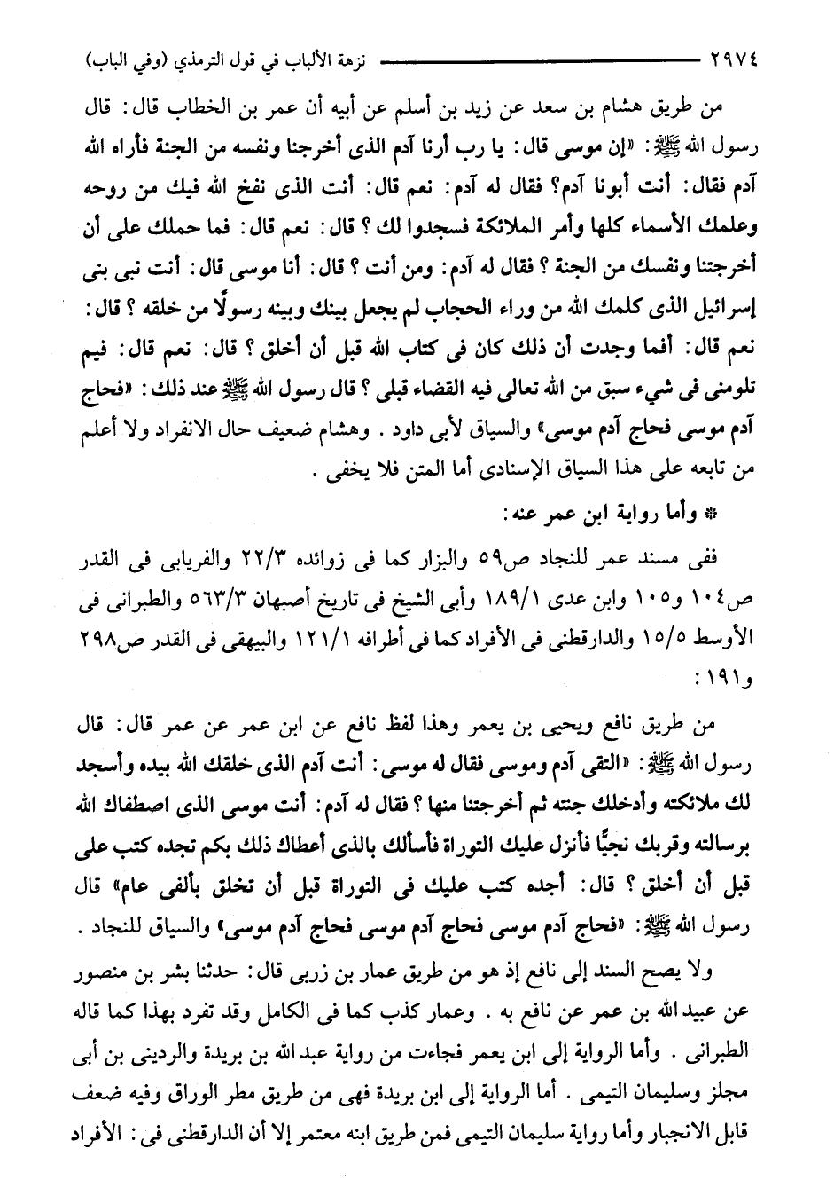 من طريق هشام بن سعد عن زيد بن أسلم عن أبيه أن عمر بن الخطاب قال: قال رسول اللَّه - صلى اللَّه عليه وسلم -: "إن موسى قال: يا رب أرنا آدم الذى أخرجنا ونفسه من الجنة فأراه اللَّه آدم فقال: أنت أبونا آدم؟ فقال له آدم: نعم قال: أنت الذى نفخ اللَّه فيك من روحه وعلمك الأسماء كلها وأمر الملائكة فسجدوا لك؟ قال: نعم قال: فما حملك على أن أخرجتنا ونفسك من الجنة؟ فقال له آدم: ومن أنت؟ قال: أنا موسى قال: أنت نبي بنى إسرائيل الذى كلمك اللَّه من وراء الحجاب لم يجعل بينك وبينه رسولا من خلقه؟ قال: نعم قال: أفما وجدت أن ذلك كان في كتاب اللَّه قبل أن أخلق؟ قال: نعم قال: فيم تلومنى في شيء سبق من اللَّه تعالى فيه القضاء قبلى؟ قال رسول اللَّه - صلى اللَّه عليه وسلم - عند ذلك: "فحاج آدم موسى فحاج آدم موسى" والسياق لأبى داود. وهشام ضعيف حال الانفراد ولا أعلم من تابعه على هذا السياق الإسنادى أما المتن فلا يخفى.