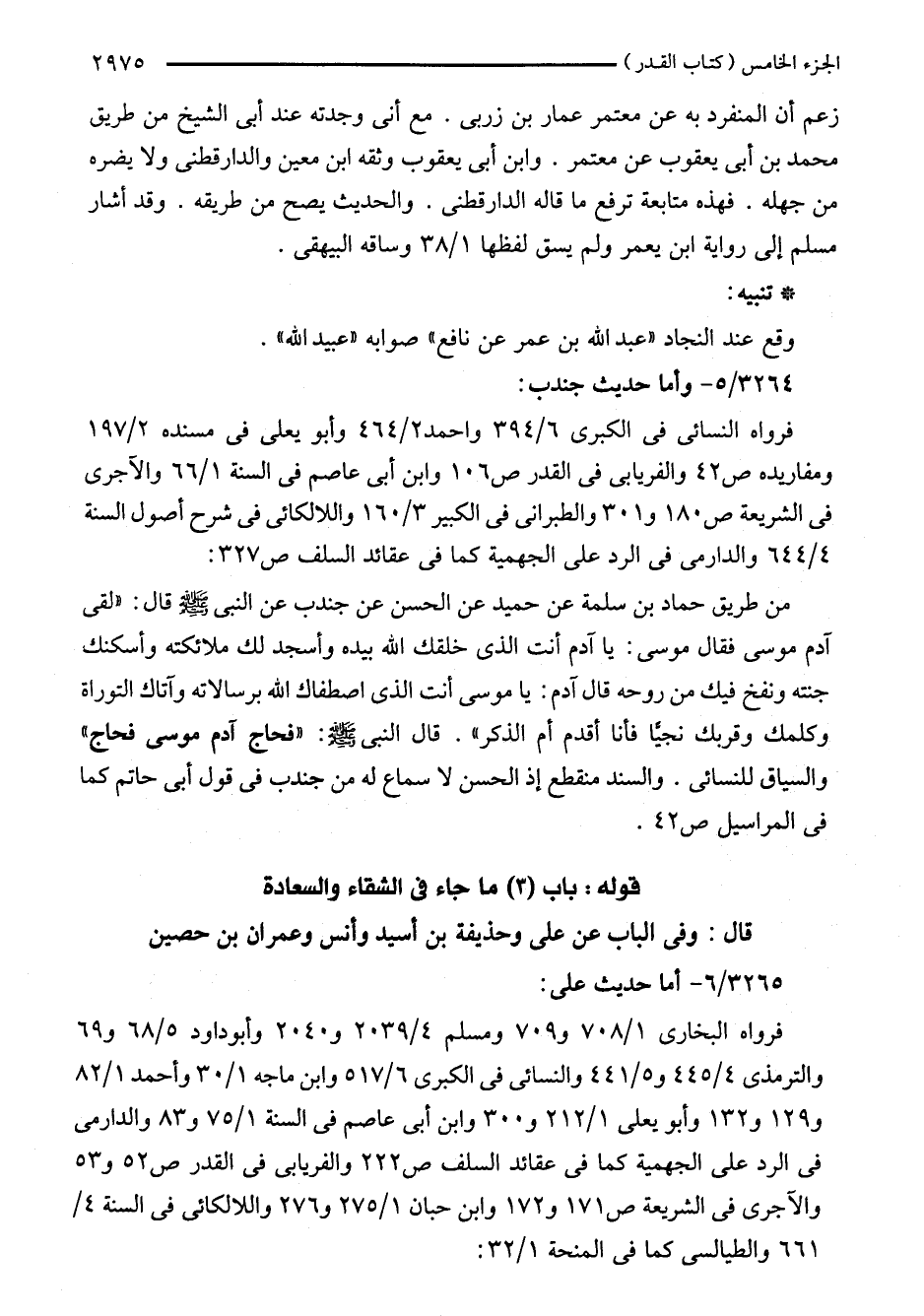 فرواه البخاري 1/ 708 و 709 ومسلم 4/ 2039 و 3040 وأبو داود 5/ 68 و 69 والترمذي 4/ 445 و 5/ 441 والنسائي في الكبرى 6/ 517 وابن ماجه 1/ 30 وأحمد 1/ 82 و 129 و 132 وأبو يعلى 1/ 212 و 300 وابن أبي عاصم في السنة 1/ 75 و 83 والدارمي في الرد على الجهمية كما في عقائد السلف ص 222 والفريابى في القدر ص 52 و 53 والآجري في الشريعة ص 171 و 172 وابن حبان 1/ 275 و 276 واللالكائى في السنة 4/ 661 والطيالسى كما في المنحة 1/ 32: