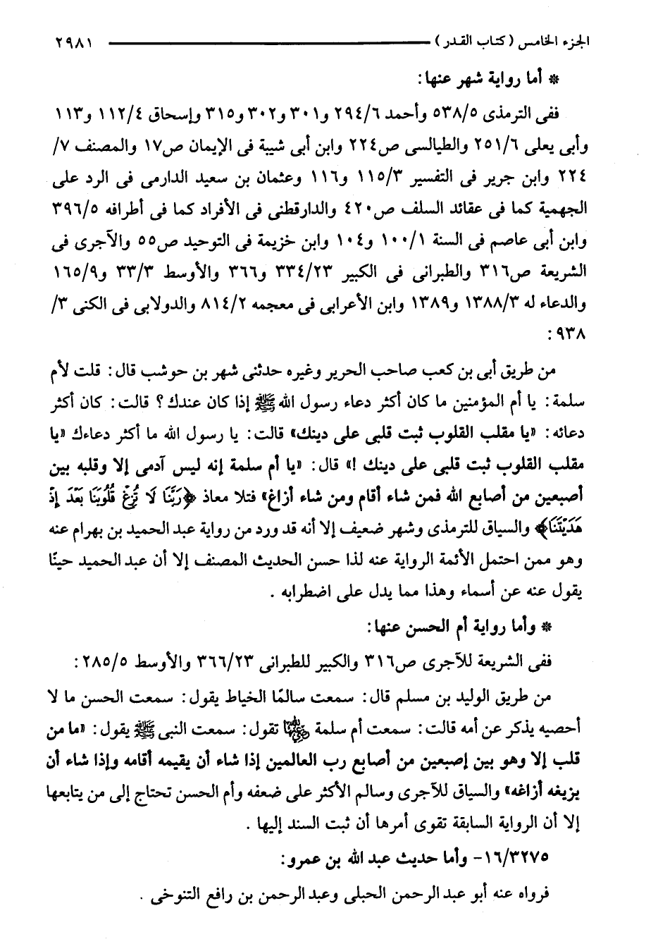 من طريق الوليد بن مسلم قال: سمعت سالمًا الخياط يقول: سمعت الحسن ما لا أحصيه يذكر عن أمه قالت: سمعت أم سلمة -رضي اللَّه عنها- تقول: سمعت النبي - صلى اللَّه عليه وسلم - يقول: "ما من قلب إلا وهو بين إصبعين من أصابع رب العالمين إذا شاء أن يقيمه أقامه وإذا شاء أن يزيغه أزاغه" والسياق للآجرى وسالم الأكثر على ضعفه وأم الحسن تحتاج إلى من يتابعها إلا أن الرواية السابقة تقوى أمرها أن ثبت السند إليها.