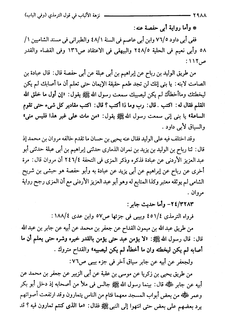 ففي أبي داود 5/ 76 وابن أبي عاصم في السنة 1/ 48 والطبراني في مسند الشاميين 1/ 58 وأبي نعيم في الحلية 5/ 248 والبيهقي في الاعتقاد ص 136 وفي القضاء والقدر ص 112: