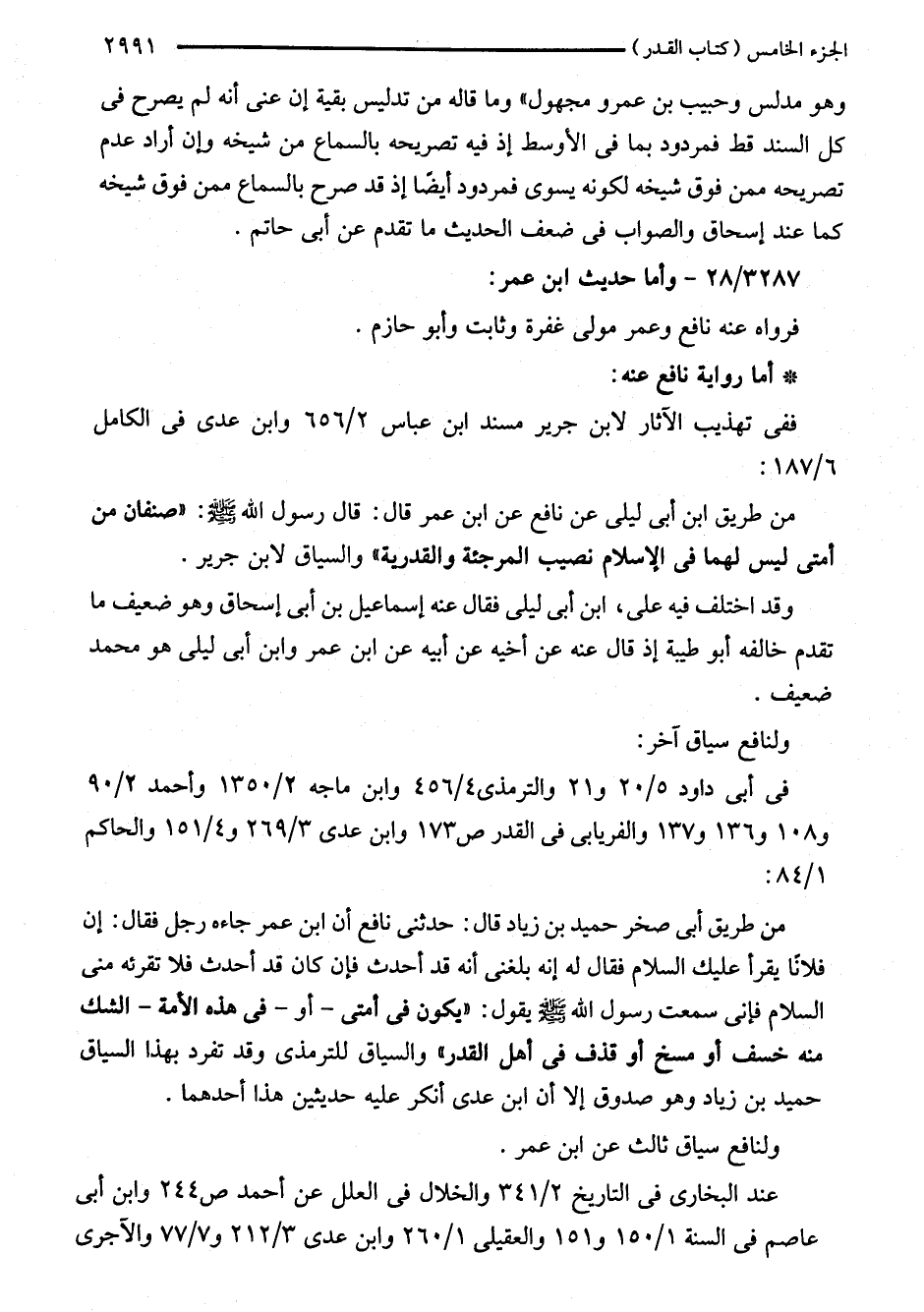 من طريق أبي صخر حميد بن زياد قال: حدثنى نافع أن ابن عمر جاءه رجل فقال: إن فلانًا يقرأ عليك السلام فقال له إنه بلغنى أنه قد أحدث فإن كان قد أحدث فلا تقرئه منى السلام فإني سمعت رسول اللَّه - صلى اللَّه عليه وسلم - يقول: "يكون في أمتى -أو- في هذه الأمة - الشك منه خسف أو مسخ أو قذف في أهل القدر" والسياق للترمذي وقد تفرد بهذا السياق حميد بن زياد وهو صدوق إلا أن ابن عدى أنكر عليه حديثين هذا أحدهما.