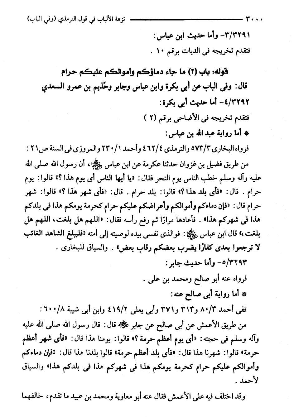 من طريق الأعمش عن أبي صالح عن جابر -رضي اللَّه عنه- قال: قال رسول اللَّه صلى اللَّه عليه وآله وسلم في حجته: "أي يوم أعظم حرمة؟ " قالوا: يومنا هذا قال: "فأى شهر أعظم حرمة" قالوا: شهرنا هذا قال: "فأى بلد أعظم حرمة" قالوا بلدنا هذا قال: "فإن دماءكم وأموالكم عليكم حرام كحرمة يومكم هذا في شهركم هذا في بلدكم هذا" والسياق لأحمد.