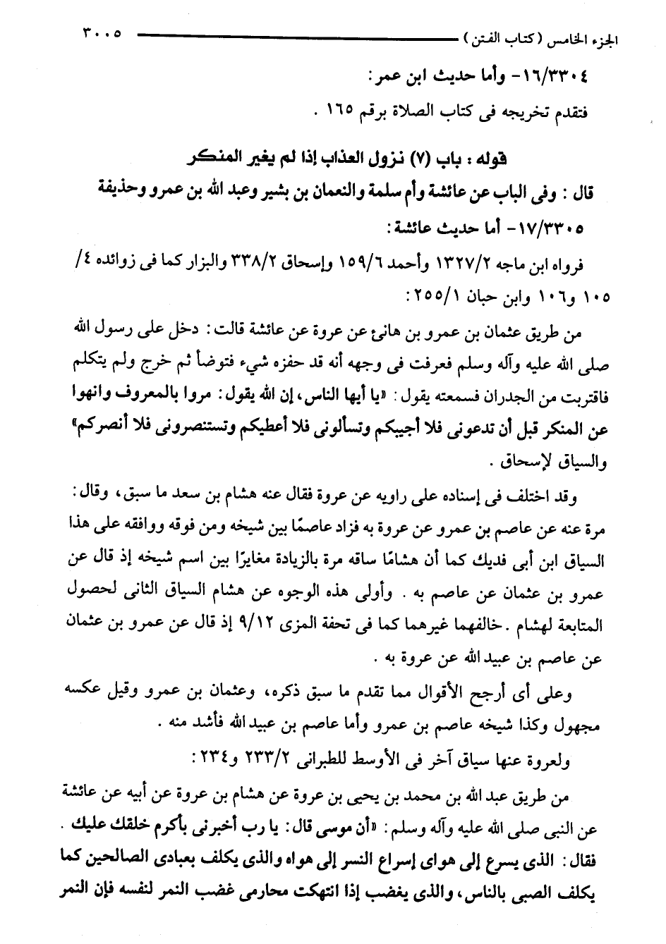 من طريق عثمان بن عمرو بن هانىء عن عروة عن عائشة قالت: دخل على رسول اللَّه صلى اللَّه عليه وآله وسلم فعرفت في وجهه أنه قد حفزه شيء فتوضأ ثم خرج ولم يتكلم فاقتربت من الجدران فسمعته يقول: "يا أيها الناس، إن اللَّه يقول: مروا بالمعروف وانهوا عن المنكر قبل أن تدعونى فلا أجيبكم وتسألونى فلا أعطيكم وتستنصرونى فلا أنصركم" والسياق لإسحاق.