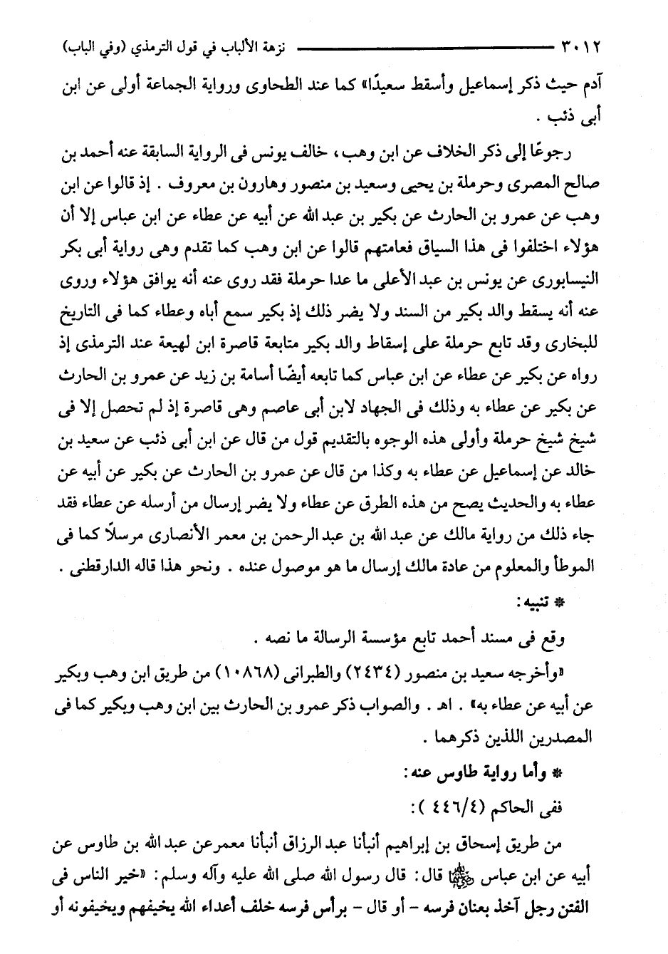 رجوعًا إلى ذكر الخلاف عن ابن وهب، خالف يونس في الرواية السابقة عنه أحمد بن صالح المصرى وحرملة بن يحيى وسعيد بن منصور وهارون بن معروف. إذ قالوا عن ابن وهب عن عمرو بن الحارث عن بكير بن عبد اللَّه عن أبيه عن عطاء عن ابن عباس إلا أن هؤلاء اختلفوا في هذا السياق فعامتهم قالوا عن ابن وهب كما تقدم وهي رواية أبي بكر النيسابورى عن يونس بن عبد الأعلى ما عدا حرملة فقد روى عنه أنه يوافق هؤلاء وروى عنه أنه يسقط والد بكير من السند ولا يضر ذلك إذ بكير سمع أباه وعطاء كما في التاريخ للبخاري وقد تابع حرملة على إسقاط والد بكير متابعة قاصرة ابن لهيعة عند الترمذي إذ رواه عن بكير عن عطاء عن ابن عباس كما تابعه أيضًا أسامة بن زيد عن عمرو بن الحارث عن بكير عن عطاء به وذلك في الجهاد لابن أبي عاصم وهي قاصرة إذ لم تحصل إلا في شيخ شيخ حرملة وأولى هذه الوجوه بالتقديم قول من قال عن ابن أبي ذئب عن سعيد بن خالد عن إسماعيل عن عطاء به وكذا من قال عن عمرو بن الحارث عن بكير عن أبيه عن عطاء به والحديث يصح من هذه الطرق عن عطاء ولا يضر إرسال من أرسله عن عطاء فقد جاء ذلك من رواية مالك عن عبد اللَّه بن عبد الرحمن بن معمر الأنصارى مرسلًا كما في الموطأ والمعلوم من عادة مالك إرسال ما هو موصول عنده. ونحو هذا قاله الدارقطني.