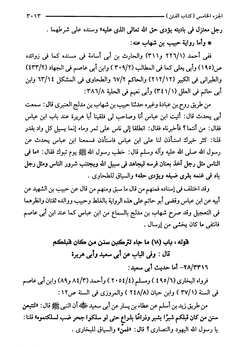 من طريق روح بن عبادة وغيره حدثنا حبيب بن شهاب بن مدلج العنبرى قال: سمعت أبي يحدث قال: أتيت ابن عباس أنا وصاحب لى فلقينا أبا هريرة عند باب ابن عباس فقال: من أنتما؟ فأخبرناه فقال: انطلقا إلى ناس على تمر وماء إنما يسيل كل واد بقدر قلنا: كثر خيرك استأذن لنا على ابن عباس فاستأذن فسمعنا ابن عباس يحدث عن رسول اللَّه صلى اللَّه عليه وآله وسلم قال: خطب رسول اللَّه - صلى اللَّه عليه وسلم - يوم تبوك فقال: "ما في الناس مثل رجل آخذ بعنان فرسه ليجاهد في سبيل اللَّه ويجتنب شرور الناس ومثل رجل باد في غنمه يقرى ضيفه ويؤدى حقه" والسياق للطحاوى.