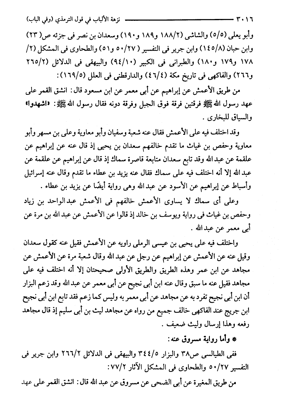 من طريق الأعمش عن إبراهيم عن أبي معمر عن ابن مسعود قال: انشق القمر على عهد رسول اللَّه - صلى اللَّه عليه وسلم - فرقتين فرقة فوق الجبل وفرقة دونه فقال رسول اللَّه - صلى اللَّه عليه وسلم -: "اشهدوا" والسياق للبخاري.