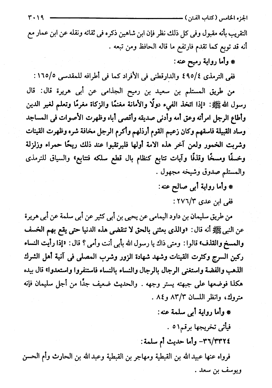 من طريق المستلم بن سعيد بن رميح الجذامى عن أبي هريرة قال: قال رسول اللَّه - صلى اللَّه عليه وسلم -: "إذا اتخذ الفيء دولًا والأمانة مغنمًا والزكاة مغرمًا وتعلم لغير الدين وأطاع الرجل امرأته وعق أمه وأدنى صديقه وأقصى أباه وظهرت الأصوات في المساجد وساد القبيلة فاسقهم وكان زعيم القوم أرذلهم وأكرم الرجل مخافة شره وظهرت القينات وشربت الخمور ولعن آخر هده الأمة أولها فليرتقبوا عند ذلك ريحًا حمراء وزلزلة وخسفًا ومسخًا وقذفًا وآيات تتابع كنظام بال قطع سلكه فتتابع" والسياق للترمذي والمستلم صدوق وشيخه مجهول.