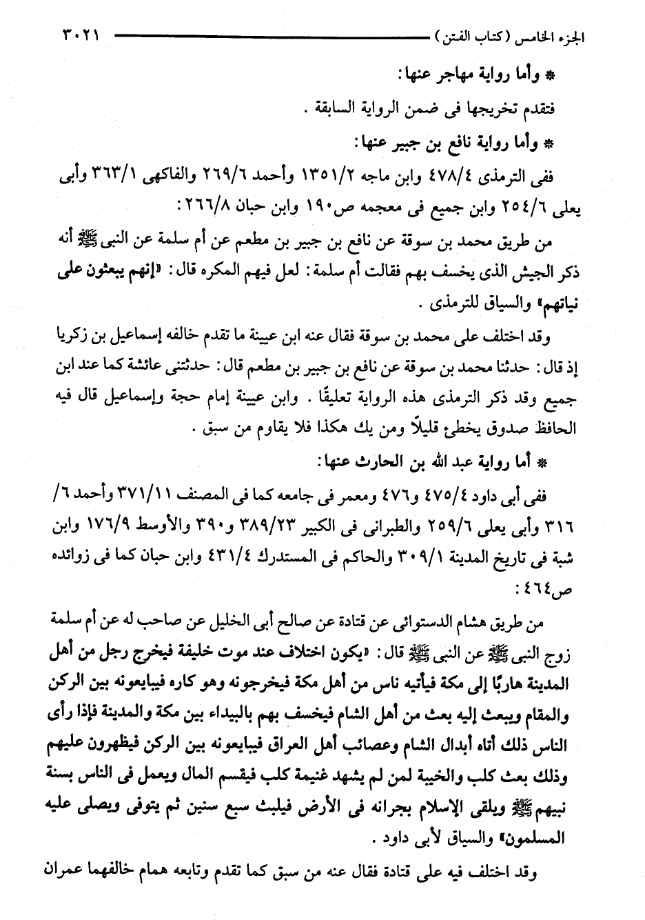 من طريق محمد بن سوقة عن نافع بن جبير بن مطعم عن أم سلمة عن النبي - صلى اللَّه عليه وسلم - أنه ذكر الجيش الذى يخسف بهم فقالت أم سلمة: لعل فيهم المكره قال: "إنهم يبعثون على نياتهم" والسياق للترمذي.