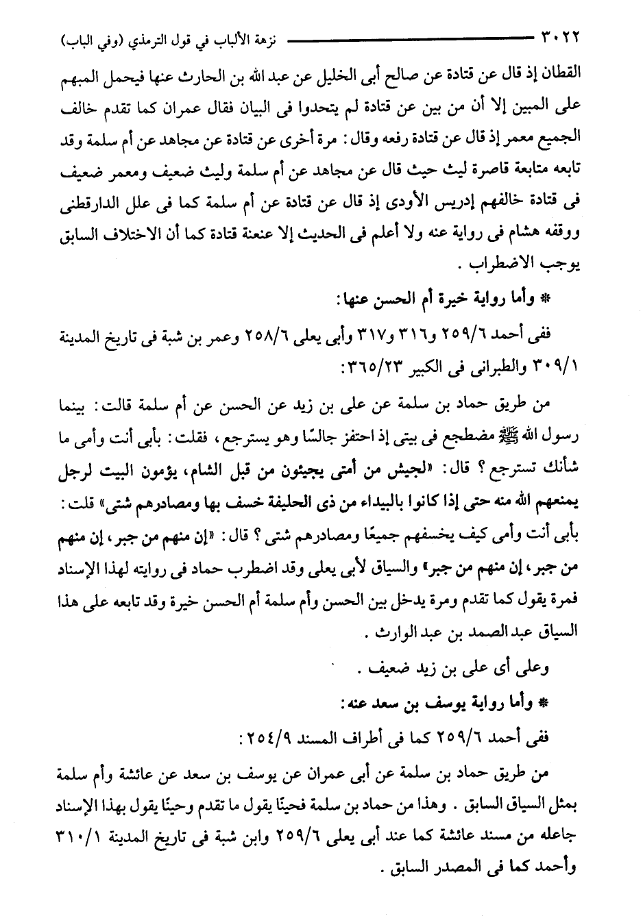ففي أحمد 6/ 259 و 316 و 317 وأبي يعلى 6/ 258 وعمر بن شبة في تاريخ المدينة 1/ 309 والطبراني في الكبير 23/ 365: من طريق حماد بن سلمة عن على بن زيد عن الحسن عن أم سلمة قالت: بينما رسول اللَّه - صلى اللَّه عليه وسلم - مضطجع في بيتى إذ احتفز جالسًا وهو يسترجع، فقلت: بأبى أنت وأمى ما شأنك تسترجع؟ قال: "لجيش من أمتى يجيئون من قبل الشام، يؤمون البيت لرجل يمنعهم اللَّه منه حتى إذا كانوا بالبيداء من ذي الحليفة خسف بها ومصادرهم شتى" قلت: بأبى أنت وأمى كيف يخسفهم جميعًا ومصادرهم شتى؟ قال: "إن منهم من جبر، إن منهم من جبر، إن منهم من جبر" والسياق لأبى يعلى وقد اضطرب حماد في روايته لهذا الإسناد فمرة يقول كما تقدم ومرة يدخل بين الحسن وأم سلمة أم الحسن خيرة وقد تابعه على هذا السياق عبد الصمد بن عبد الوارث.