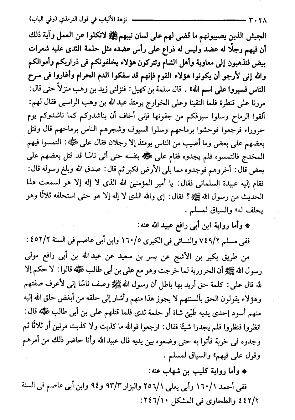 من طريق بكير بن الأشج عن بسر بن سعيد عن عبد اللَّه بن أبي رافع مولى رسول اللَّه - صلى اللَّه عليه وسلم - أن الحرورية لما خرجت وهو مع على بن أبي طالب -رضي اللَّه عنه- قالوا: لا حكم إلا للَّه قال على: كلمة حق أريد بها باطل أن رسول اللَّه - صلى اللَّه عليه وسلم - وصف ناسًا إني لأعرف صفتهم وهؤلاء يقولون الحق بألسنتهم لا يجوز هذا منهم وأشار إلى حلقه من أبغض حلق اللَّه إليه منهم أسود إحدى يديه طَبْيُ شاة أو حلمة ثدي فلما قتلهم على بن أبي طالب -رضي اللَّه عنه- قال: انظروا فنظروا فلم يجدوا شيئًا فقال: ارجعوا فواللَّه ما كذبت ولا كذبت مرتين أو ثلاثًا ثم وجدوه في خربة فأتوا به حتى وضعوه بين يديه قال عبيد اللَّه وأنا حاضر ذلك من أمرهم وقول على فيهم" والسياق لمسلم.