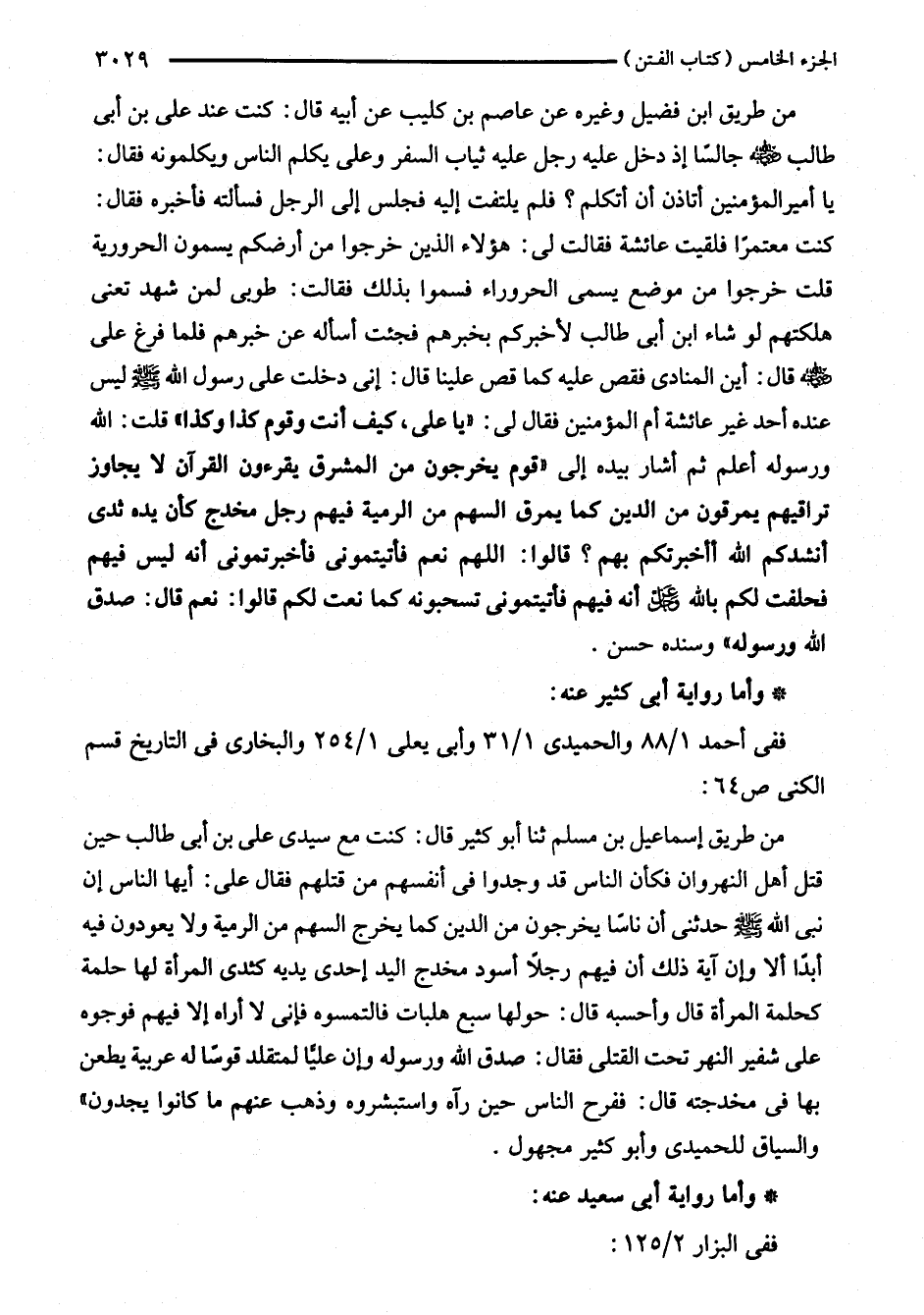 من طريق إسماعيل بن مسلم ثنا أبو كثير قال: كنت مع سيدى على بن أبي طالب حين قتل أهل النهروان فكان الناس قد وجدوا في أنفسهم من قتلهم فقال على: أيها الناس إن نبي اللَّه - صلى اللَّه عليه وسلم - حدثنى أن ناسًا يخرجون من الدين كما يخرج السهم من الرمية ولا يعودون فيه أبدًا ألا وإن آية ذلك أن فيهم رجلًا أسود مخدج اليد إحدى يديه كثدي المرأة لها حلمة كحلمة المرأة قال وأحسبه قال: حولها سبع هلبات فالتمسوه فإني لا أراه إلا فيهم فوجوه على شفير النهر تحت القتلى فقال: صدق اللَّه ورسوله وإن عليًّا لمتقلد قوسًا له عربية يطعن بها في مخدجته قال: ففرح الناس حين رآه واستبشروه وذهب عنهم ما كانوا يجدون" والسياق للحميدى وأبو كثير مجهول.