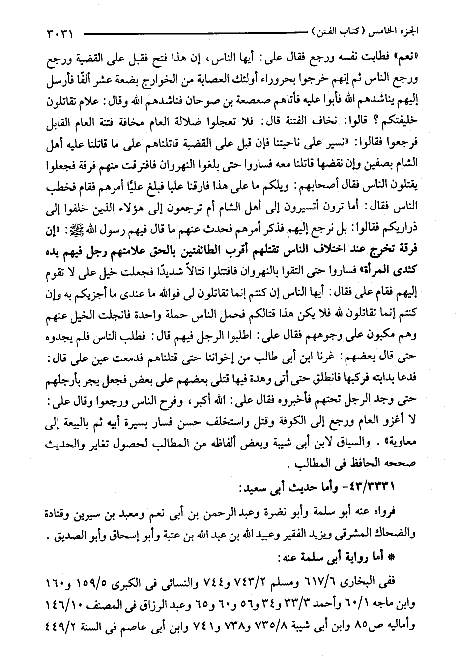 "نعم" فطابت نفسه ورجع فقال على: أيها الناس، إن هذا فتح فقبل على القضية ورجع ورجع الناس ثم إنهم خرجوا بحروراء أولئك العصابة من الخوارج بضعة عشر ألفًا فأرسل إليهم يناشدهم اللَّه فأبوا عليه فأتاهم صعصعة بن صوحان فناشدهم اللَّه وقال: علام تقاتلون خليفتكم؟ قالوا: نخاف الفتنة قال: فلا تعجلوا ضلالة العام مخافة فتنة العام القابل فرجعوا فقالوا: "نسير على ناحيتنا فإن قبل على القضية قاتلناهم على ما قاتلنا عليه أهل الشام بصفين وإن نقضها قاتلنا معه فساروا حتى بلغوا النهروان فافترقت منهم فرقة فجعلوا يقتلون الناس فقال أصحابهم: ويلكم ما على هذا فارقنا عليا فبلغ عليًّا أمرهم فقام فخطب الناس فقال: أما ترون أتسيرون إلى أهل الشام أم ترجعون إلى هؤلاء الذين خلفوا إلى ذراريكم فقالوا: بل نرجع إليهم فذكر أمرهم فحدث عنهم ما قال فيهم رسول اللَّه - صلى اللَّه عليه وسلم -: "إن فرقة تخرج عند اختلاف الناس تقتلهم أقرب الطائفتين بالحق علامتهم رجل فيهم يده كثدي المرأة" فساروا حتى التقوا بالنهروان فاقتتلوا قتالًا شديدًا فجعلت خيل على لا تقوم إليهم فقام على فقال: أيها الناس إن كنتم إنما تقاتلون لى فواللَّه ما عندى ما أجزيكم به وإن كنتم إنما تقاتلون للَّه فلا يكن هذا قتالكم فحمل الناس حملة واحدة فانجلت الخيل عنهم وهم مكبون على وجوههم فقال على: اطلبوا الرجل فيهم قال: فطلب الناس فلم يجدوه حتى قال بعضهم: غرنا ابن أبي طالب من إخواننا حتى قتلناهم فدمعت عين على قال: فدعا بدابته فركبها فانطلق حتى أتى وهدة فيها قتلى بعضهم على بعض فجعل يجر بأرجلهم حتى وجد الرجل تحتهم فأخبروه فقال على: اللَّه أكبر، وفرح الناس ورجعوا وقال على: لا أغزو العام ورجع إلى الكوفة وقتل واستخلف حسن فسار بسيرة أبيه ثم بالبيعة إلى معاوية". والسياق لابن أبي شيبة وبعض ألفاظه من المطالب لحصول تغاير والحديث صححه الحافظ في المطالب.