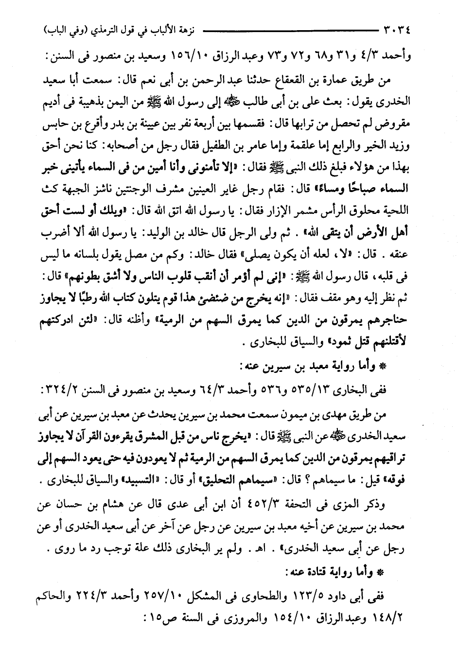 من طريق عمارة بن القعقاع حدثنا عبد الرحمن بن أبي نعم قال: سمعت أبا سعيد الخدرى يقول: بعث على بن أبي طالب -رضي اللَّه عنه- إلى رسول اللَّه - صلى اللَّه عليه وسلم - من اليمن بذهيبة في أديم مقروض لم تحصل من ترابها قال: فقسمها بين أربعة نفر بين عيينة بن بدر وأقرع بن حابس وزيد الخير والرابع إما علقمة وإما عامر بن الطفيل فقال رجل من أصحابه: كنا نحن أحق بهذا من هؤلاء فبلغ ذلك النبي - صلى اللَّه عليه وسلم - فقال: "إلا تأمنونى وأنا أمين من في السماء يأتينى خبر السماء صباحًا ومساءً" قال: فقام رجل غاير العينين مشرف الوجنتين ناشز الجبهة كث اللحية محلوق الرأس مشمر الإزار فقال: يا رسول اللَّه اتق اللَّه قال: "ويلك أو لست أحق أهل الأرض أن يتقى اللَّه". ثم ولى الرجل قال خالد بن الوليد: يا رسول اللَّه ألا أضرب عنقه. قال: "لا، لعله أن يكون يصلى" فقال خالد: وكم من مصل يقول بلسانه ما ليس في قلبه، قال رسول اللَّه - صلى اللَّه عليه وسلم -: "إني لم أؤمر أن أنقب قلوب الناس ولا أشق بطونهم" قال: ثم نظر إليه وهو مقف فقال: "إنه يخرج من ضئضئ هذا قوم يتلون كتاب اللَّه رطبًا لا يجاوز حناجرهم يمرقون من الدين كما يمرق السهم من الرمية" وأظنه قال: "لئن أدركتهم لأقتلنهم قتل ثمود" والسياق للبخاري.