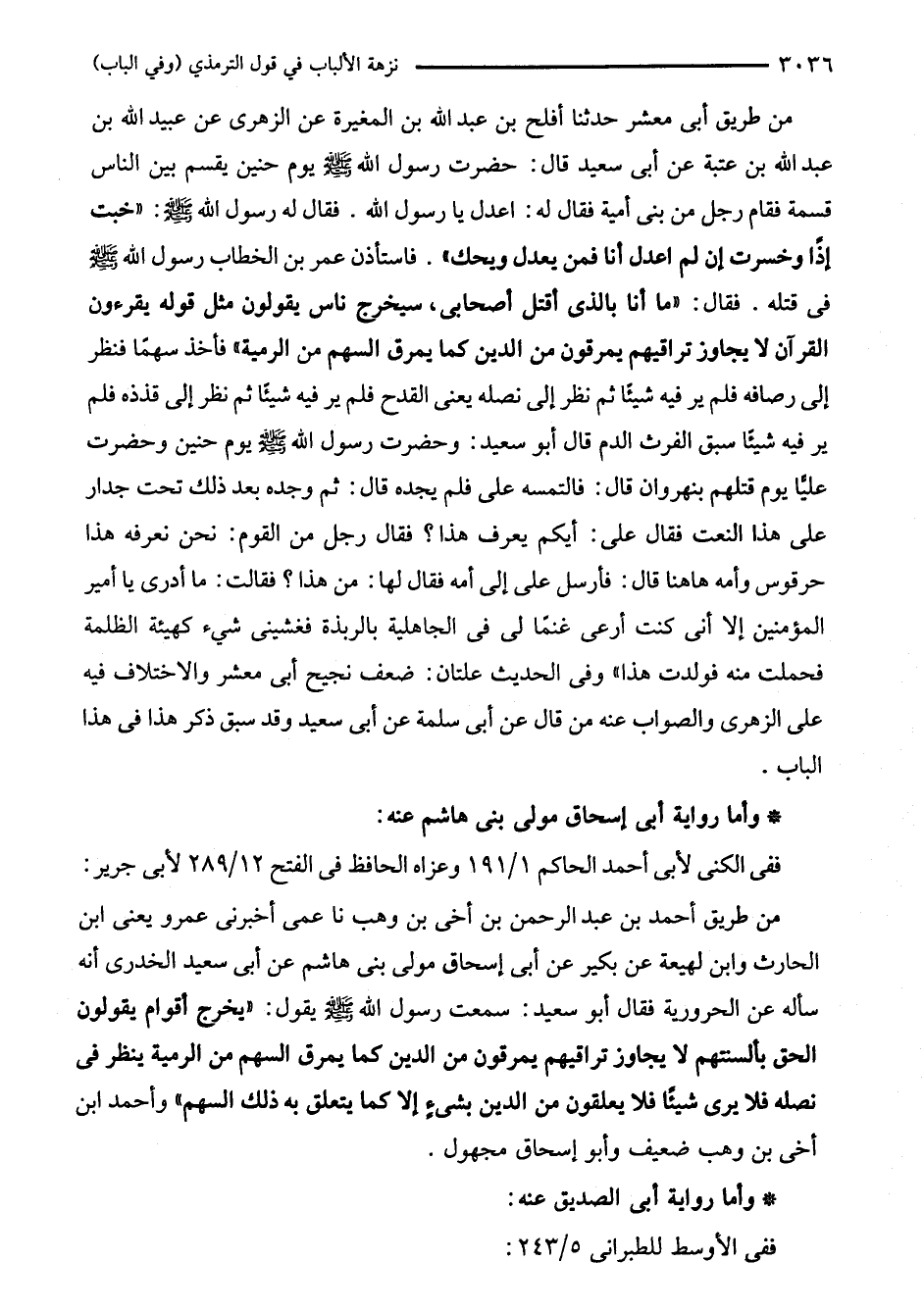 من طريق أحمد بن عبد الرحمن بن أخى بن وهب نا عمى أخبرنى عمرو يعنى ابن الحارث وابن لهيعة عن بكير عن أبي إسحاق مولى بنى هاشم عن أبي سعيد الخدرى أنه سأله عن الحرورية فقال أبو سعيد: سمعت رسول اللَّه - صلى اللَّه عليه وسلم - يقول: "يخرج أقوام يقولون الحق بألسنتهم لا يجاوز تراقيهم يمرقون من الدين كما يمرق السهم من الرمية ينظر في نصله فلا يرى شيئًا فلا يعلقون من الدين بشيءٍ إلا كما يتعلق به ذلك السهم" وأحمد ابن أخى بن وهب ضعيف وأبو إسحاق مجهول.