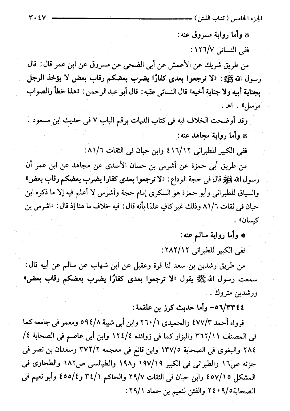 من طريق شريك عن الأعمش عن أبي الضحى عن مسروق عن ابن عمر قال: قال رسول اللَّه - صلى اللَّه عليه وسلم -: "لا ترجعوا بعدى كفارًا يضرب بعضكم رقاب بعض لا يؤخذ الرجل بجناية أبيه ولا جناية أخيه" قال النسائي عقبه: قال أبو عبد الرحمن: "هذا خطأ والصواب مرسل". اهـ.