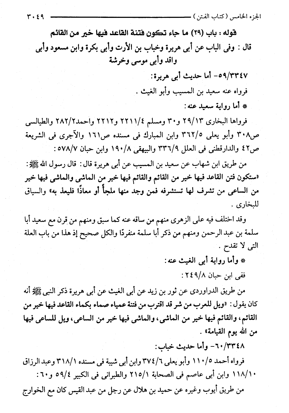 من طريق ابن شهاب عن سعيد بن المسيب عن أبي هريرة قال: قال رسول اللَّه - صلى اللَّه عليه وسلم -: "ستكون فتن القاعد فيها خير من القائم والقائم فيها خير من الماشى والماشى فيها خير من الساعى من تشرف لها تستشرفه فمن وجد منها ملجأً أو معاذًا فليعذ به" والسياق للبخاري.