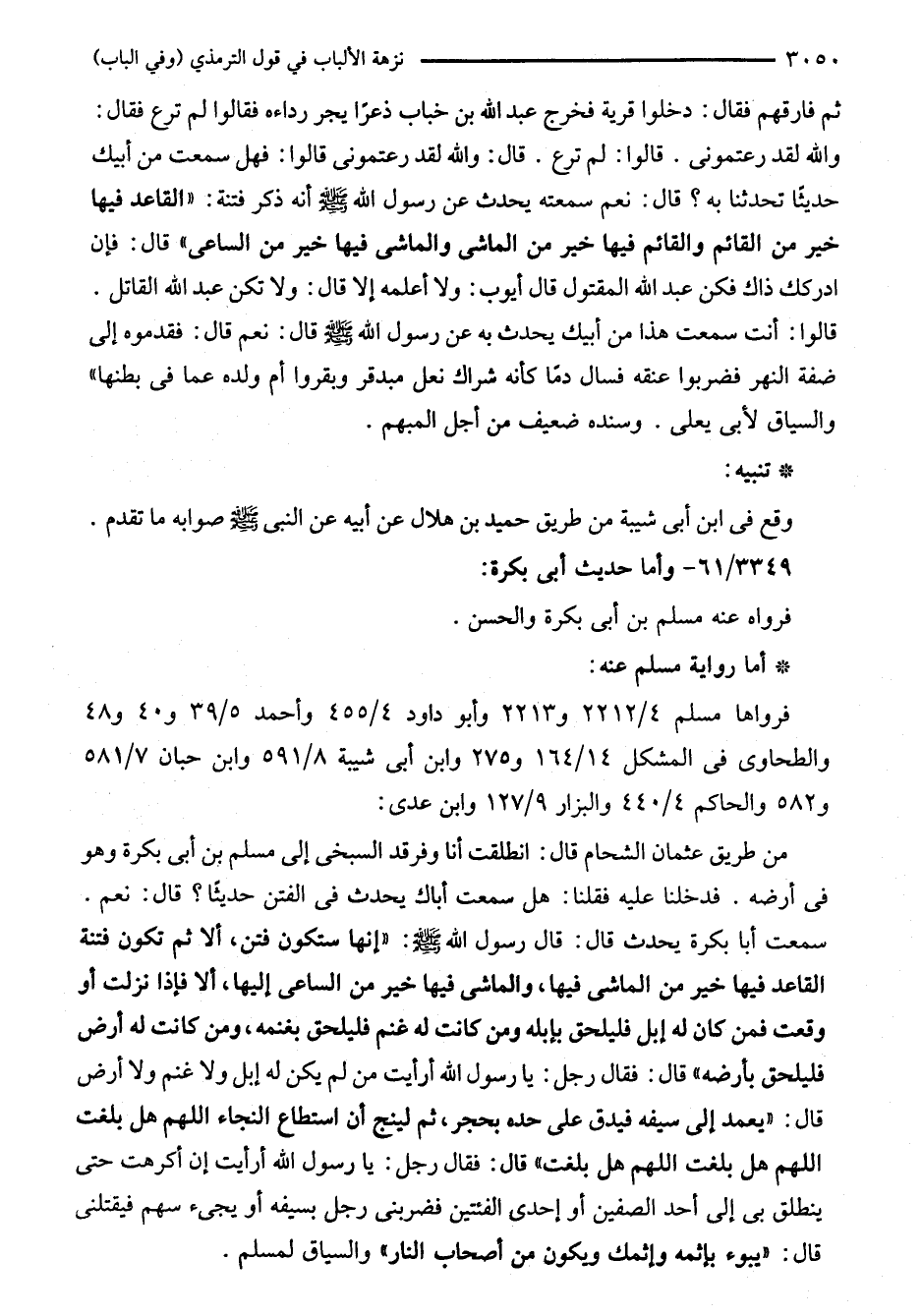 من طريق عثمان الشحام قال: انطلقت أنا وفرقد السبخى إلى مسلم بن أبي بكرة وهو في أرضه. فدخنا عليه فقلنا: هل سمعت أباك يحدث في الفتن حديثًا؟ قال: نعم. سمعت أبا بكرة يحدث قال: قال رسول اللَّه - صلى اللَّه عليه وسلم -: "إنها ستكون فتن، ألا ثم تكون فتنة القاعد فيها خير من الماشى فيها، والماشى فيها خير من الساعى إليها، ألا فإذا نزلت أو وقعت فمن كان له إبل فليلحق بإبله ومن كانت له غنم فليلحق بغنمه، ومن كانت له أرض فليلحق بأرضه" قال: فقال رجل: يا رسول اللَّه أرأيت من لم يكن له إبل ولا غنم ولا أرض قال: "يعمد إلى سيفه فيدق على حده بحجر، ثم لينج أن استطاع النجاء اللهم هل بلغت اللهم هل بلغت اللهم هل بلغت" قال: فقال رجل: يا رسول اللَّه أرأيت إن أكرهت حتى ينطلق بى إلى أحد الصفين أو إحدى الفئتين فضربنى رجل بسيفه أو يجىء سهم فيقتلنى قال: "يبوء بإثمه وإثمك ويكون من أصحاب النار" والسياق لمسلم.