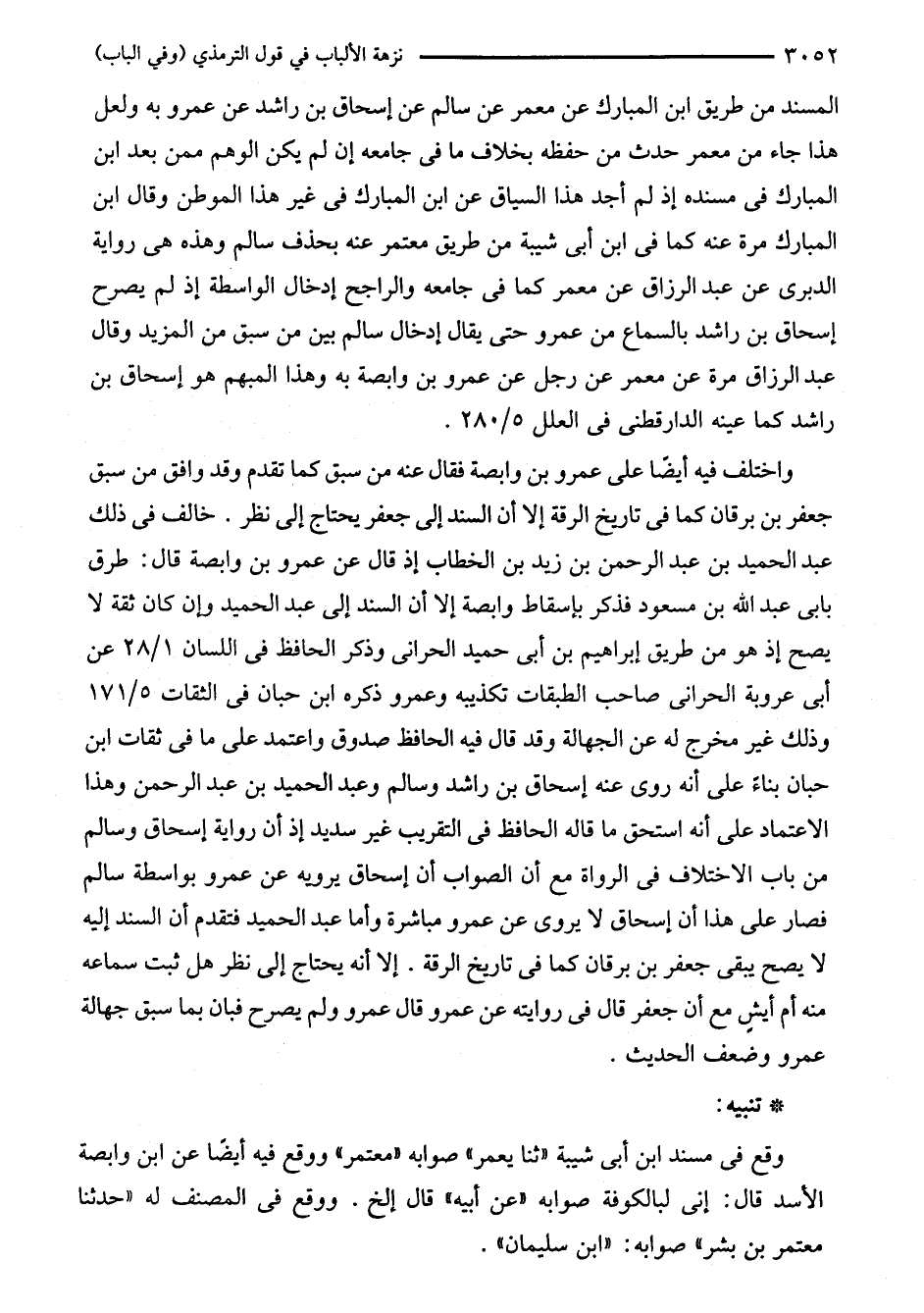 واختلف فيه أيضًا على عمرو بن وابصة فقال عنه من سبق كما تقدم وقد وافق من سبق جعفر بن برقان كما في تاريخ الرقة إلا أن السند إلى جعفر يحتاج إلى نظر. خالف في ذلك عبد الحميد بن عبد الرحمن بن زيد بن الخطاب إذ قال عن عمرو بن وابصة قال: طرق بابى عبد اللَّه بن مسعود فذكر بإسقاط وابصة إلا أن السند إلى عبد الحميد وإن كان ثقة لا يصح إذ هو من طريق إبراهيم بن أبي حميد الحرانى وذكر الحافظ في اللسان 1/ 28 عن أبي عروبة الحرانى صاحب الطبقات تكذيبه وعمرو ذكره ابن حبان في الثقات 5/ 171 وذلك غير مخرج له عن الجهالة وقد قال فيه الحافظ صدوق واعتمد على ما في ثقات ابن حبان بناء على أنه روى عنه إسحاق بن راشد وسالم وعبد الحميد بن عبد الرحمن وهذا الاعتماد على أنه استحق ما قاله الحافظ في التقريب غير سديد إذ أن رواية إسحاق وسالم من باب الاختلاف في الرواة مع أن الصواب أن إسحاق يرويه عن عمرو بواسطة سالم فصار على هذا أن إسحاق لا يروى عن عمرو مباشرة وأما عبد الحميد فتقدم أن السند إليه لا يصح يبقى جعفر بن برقان كما في تاريخ الرقة. إلا أنه يحتاج إلى نظر هل ثبت سماعه منه أم أيشٍ مع أن جعفر قال في روايته عن عمرو قال عمرو ولم يصرح فبان بما سبق جهالة عمرو وضعف الحديث.
