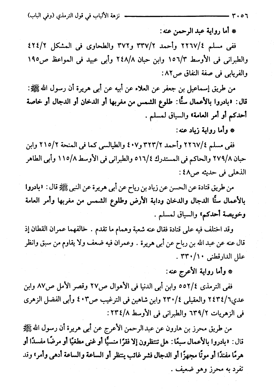 من طريق محرز بن هارون عن عبد الرحمن الأعرج عن أبي هريرة أن رسول اللَّه - صلى اللَّه عليه وسلم - قال: "بادروا بالأعمال سبعًا: هل ننتظرون إلا فقرًا منسيًّا أو غنى مطغيًا أو مرضًا مفسدًا أو هرمًا مفندًا أو موتًا مجهزًا أو الدجال فشر غائب ينتظر أو الساعة والساعة أدهى وأمر" وقد تفرد به محرز وهو ضعيف.