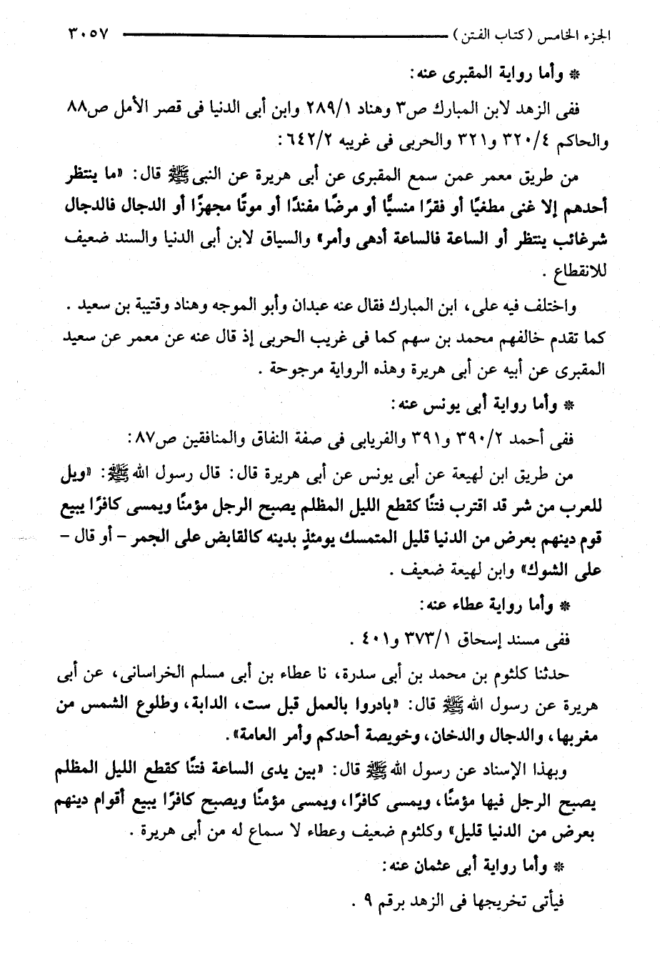وبهذا الإسناد عن رسول اللَّه - صلى اللَّه عليه وسلم - قال: "بين يدى الساعة فتنًا كقطع الليل المظلم يصبح الرجل فيها مؤمنًا، ويمسى كافرًا، ويمسى مؤمنًا ويصبح كافرًا يبيع أقوام دينهم بعرض من الدنيا قليل" وكلثوم ضعيف وعطاء لا سماع له من أبي هريرة.
