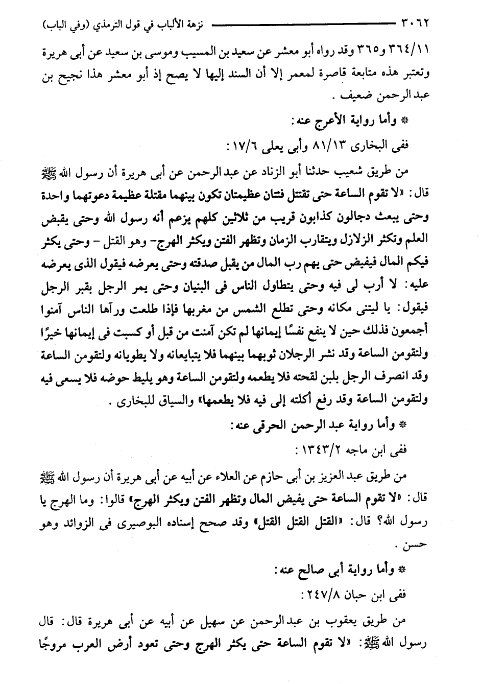 من طريق شعيب حدثنا أبو الزناد عن عبد الرحمن عن أبي هريرة أن رسول اللَّه -رضي اللَّه عنه- قال: "لا تقوم الساعة حتى تقتتل فئتان عظيمتان تكون بينهما مقتلة عظيمة دعوتهما واحدة وحتى يبعث دجالون كذابون قريب من ثلاثين كلهم يزعم أنه رسول اللَّه وحتى يقبض العلم وتكثر الزلازل ويقارب الزمان وتظهر الفتن ويكثر الهرج -وهو القتل- وحتى يكثر فيكم المال فيفيض حتى يهم رب المال من يقبل صدقته وحتى يعرضه فيقول الذى يعرضه عليه: لا أرب لى فيه وحتى يتطاول الناس في البنيان وحتى يمر الرجل بقبر الرجل فيقول: يا ليتنى مكانه وحتى تطلع الشمس من مغربها فإذا طلعت ورآها الناس آمنوا أجمعون فذلك حين لا ينفع نفسًا إيمانها لم تكن آمنت من قبل أو كسبت في إيمانها خيرًا ولتقومن الساعة وقد نشر الرجلان ثوبهما بينهما فلا يتبايعانه ولا يطويانه ولتقومن الساعة وقد انصرف الرجل بلبن لقحته فلا يطعمه ولتقومن الساعة وهو يليط حوضه فلا يسعى فيه ولتقومن الساعة وقد رفع أكلته إلى فيه فلا يطعمها" والسياق للبخاري.
