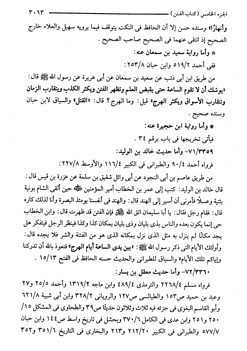 من طريق ابن أبي ذئب عن سعيد بن سمعان عن أبي هريرة عن رسول اللَّه - صلى اللَّه عليه وسلم - قال: "يوشك أن لا تقوم الساعة حتى يقبض العلم وتظهر الفتن ويكثر الكذب ويتقارب الزمان وتتقارب الأسواق ويكثر الهرج" قيل وما الهرج؟ قال: "القتل" والسياق لابن حبان وسنده صحيح.