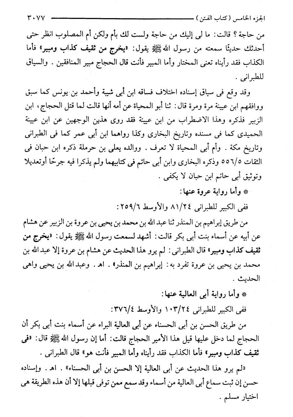من طريق إبراهيم بن المنذر ثنا عبد اللَّه بن محمد بن يحيى بن عروة بن الزبير عن هشام عن أبيه عن أسماء بنت أبي بكر قالت: أشهد لسمعت رسول اللَّه - صلى اللَّه عليه وسلم - يقول: "يخرج من ثقيف كذاب ومبير" قال الطبراني: لم يرو هذا الحديث عن هشام بن عروة إلا عبد اللَّه بن محمد بن يحيى بن عروة تفرد به: إبراهيم بن المنذر". اهـ. وعبد اللَّه بن يحيى واهى الحديث.